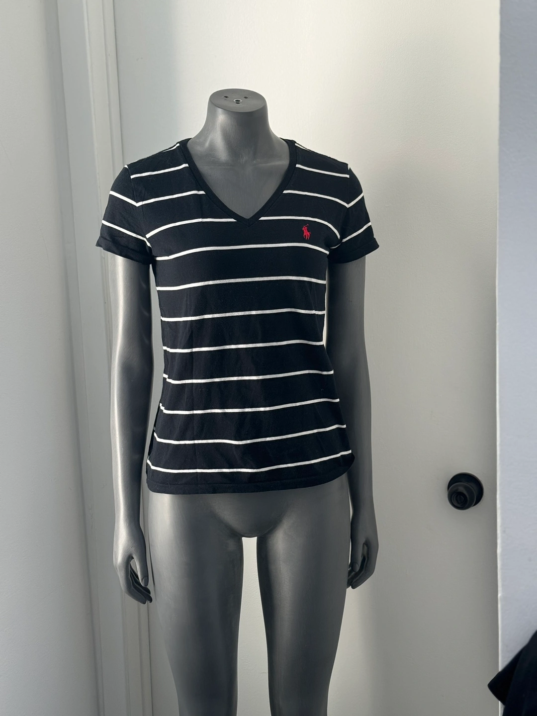 Black and white striped t-shirt with a v-neck and a small red polo player logo on the left side of the chest. NWOT. Never worn