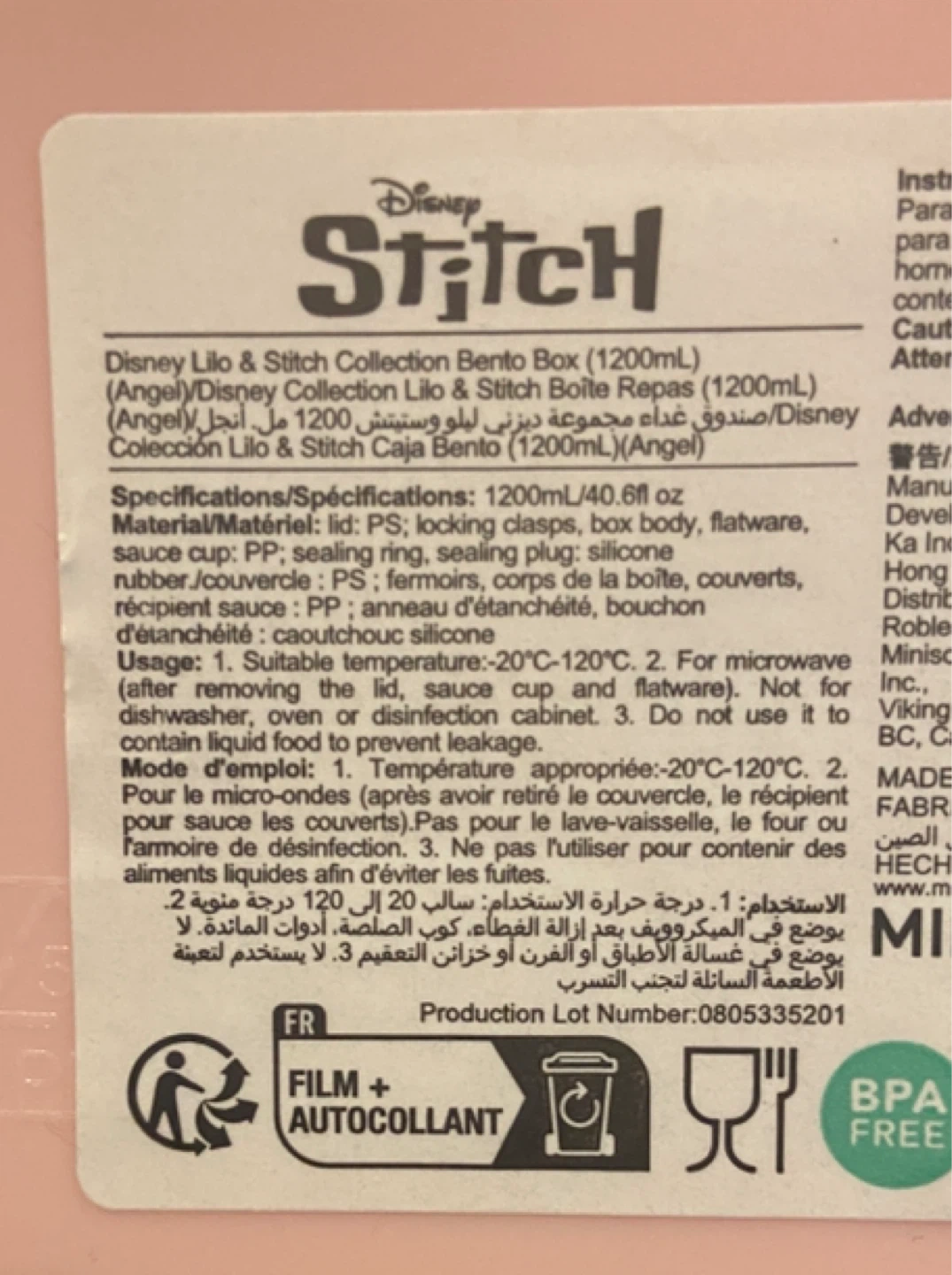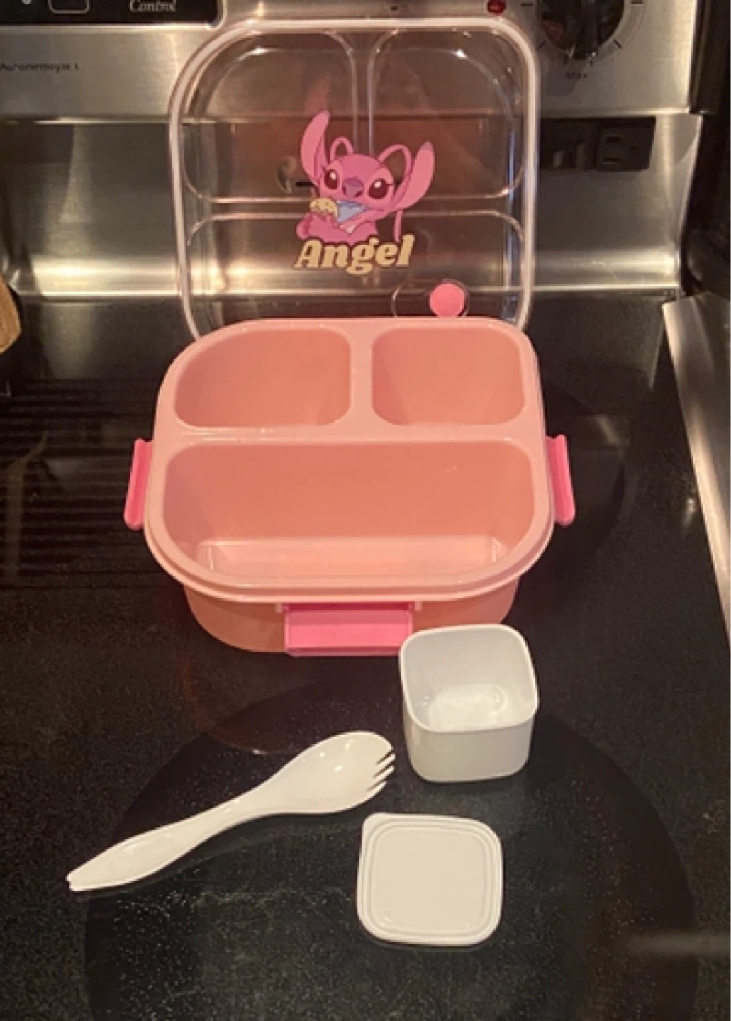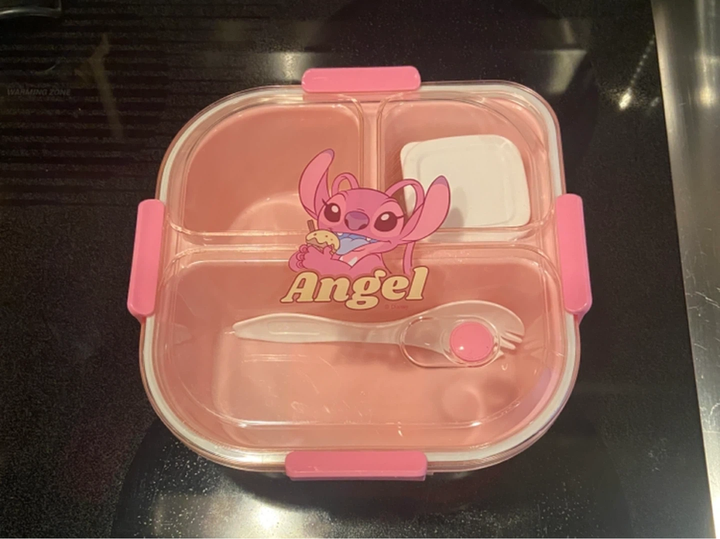 This is a pink Disney Stitch Collection bento box featuring Angel. It's made of PP material and includes a lid, sealing plug, locking clasps, a fork and a small sauce cup. It's suitable for temperatures from -20°C to 120°C and is BPA-free. It's perfect for packing lunches for kids or adults!