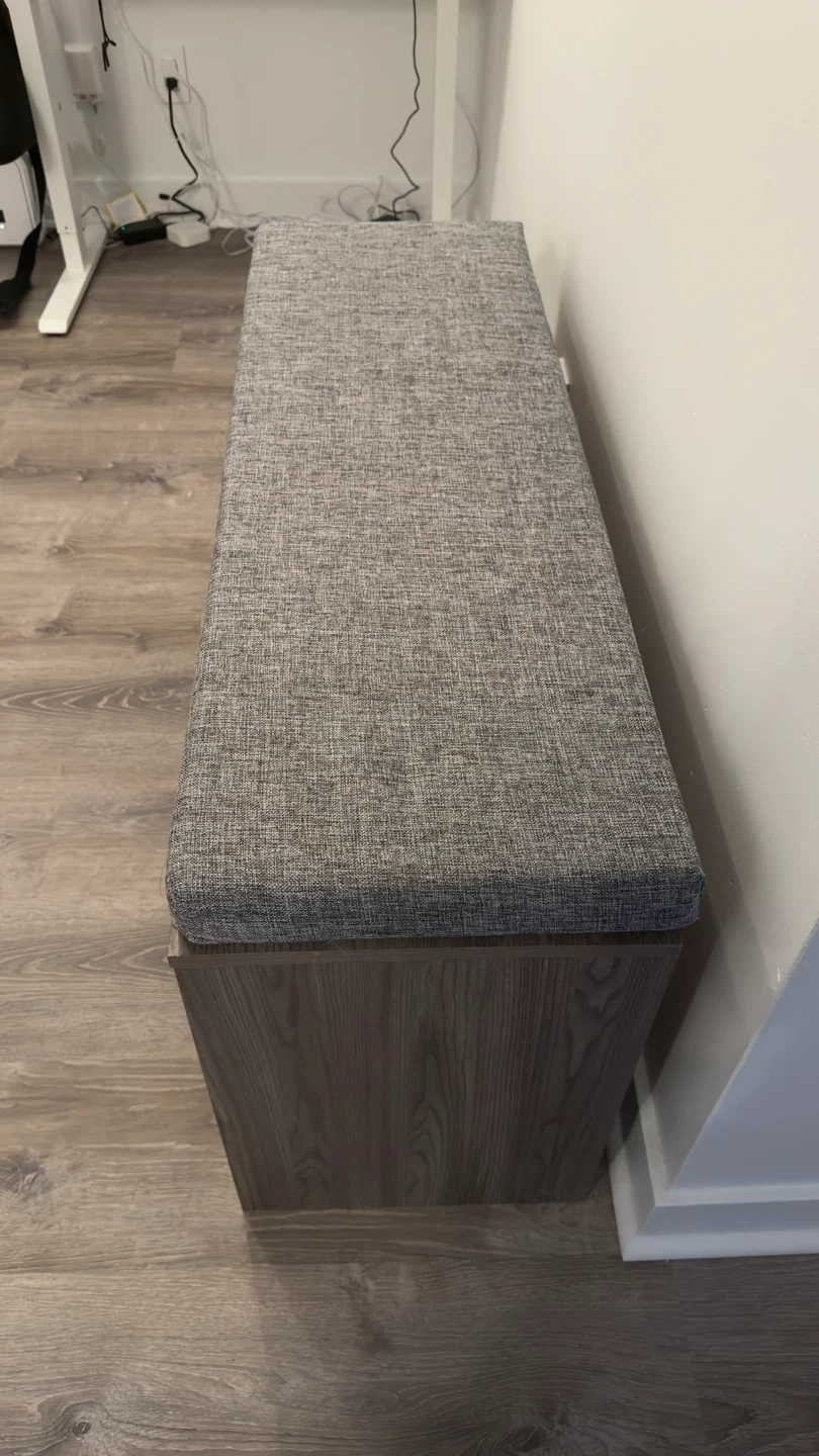 This storage bench features a grey upholstered seat and a wood-grain finish with three open cubbies below. It's a practical piece for entryways or bedrooms. The bench offers seating and convenient storage for shoes, bags, or other items.