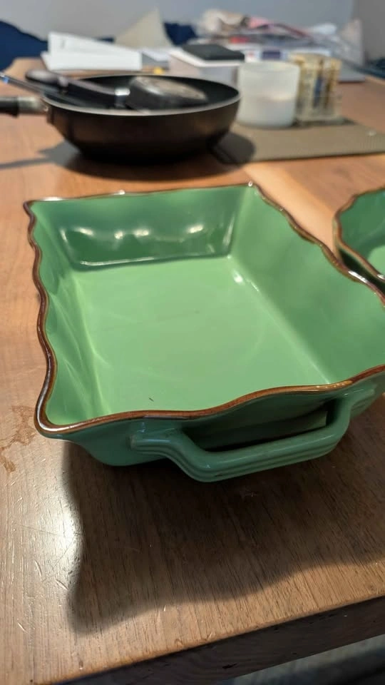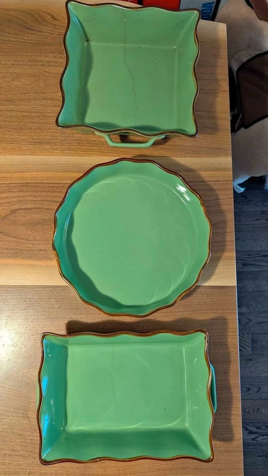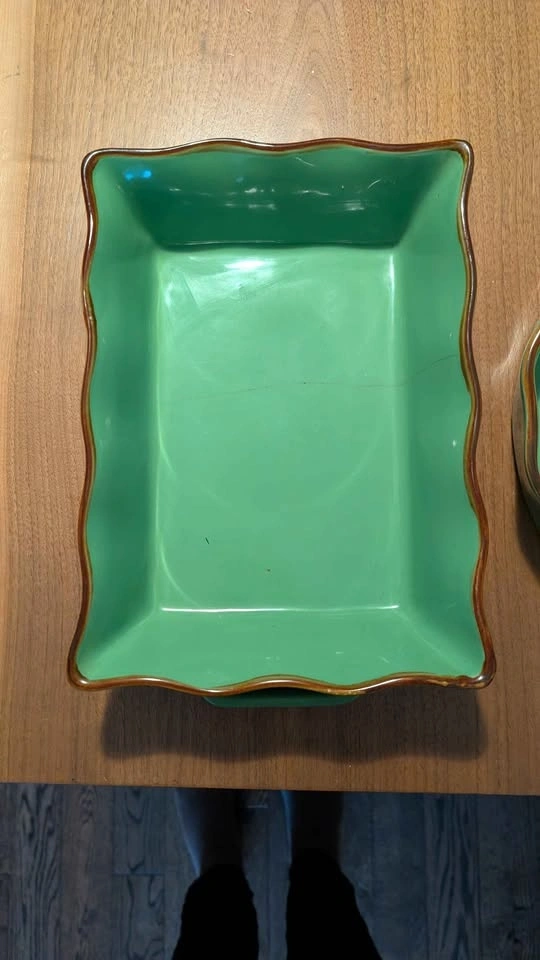 Beautiful green ceramic dishes with brown edges. Includes a square dish with handles, a round plate, and a rectangular dish. Round dish in perfect unused condition. Square and rectangular dish are cracked, hence the price. Located near Greenwood and Danforth area m4j5a4. Lots of other household items, women's clothes, kids clothes, twin items, baby items, bottles, high chairs, stroller, toys, etc available. Check out my other ads!!