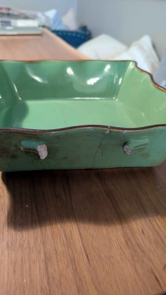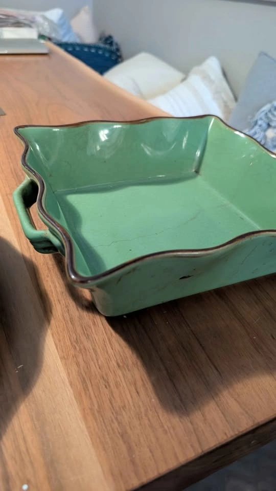 Beautiful green ceramic dishes with brown edges. Includes a square dish with handles, a round plate, and a rectangular dish. Round dish in perfect unused condition. Square and rectangular dish are cracked, hence the price. Located near Greenwood and Danforth area m4j5a4. Lots of other household items, women's clothes, kids clothes, twin items, baby items, bottles, high chairs, stroller, toys, etc available. Check out my other ads!!
