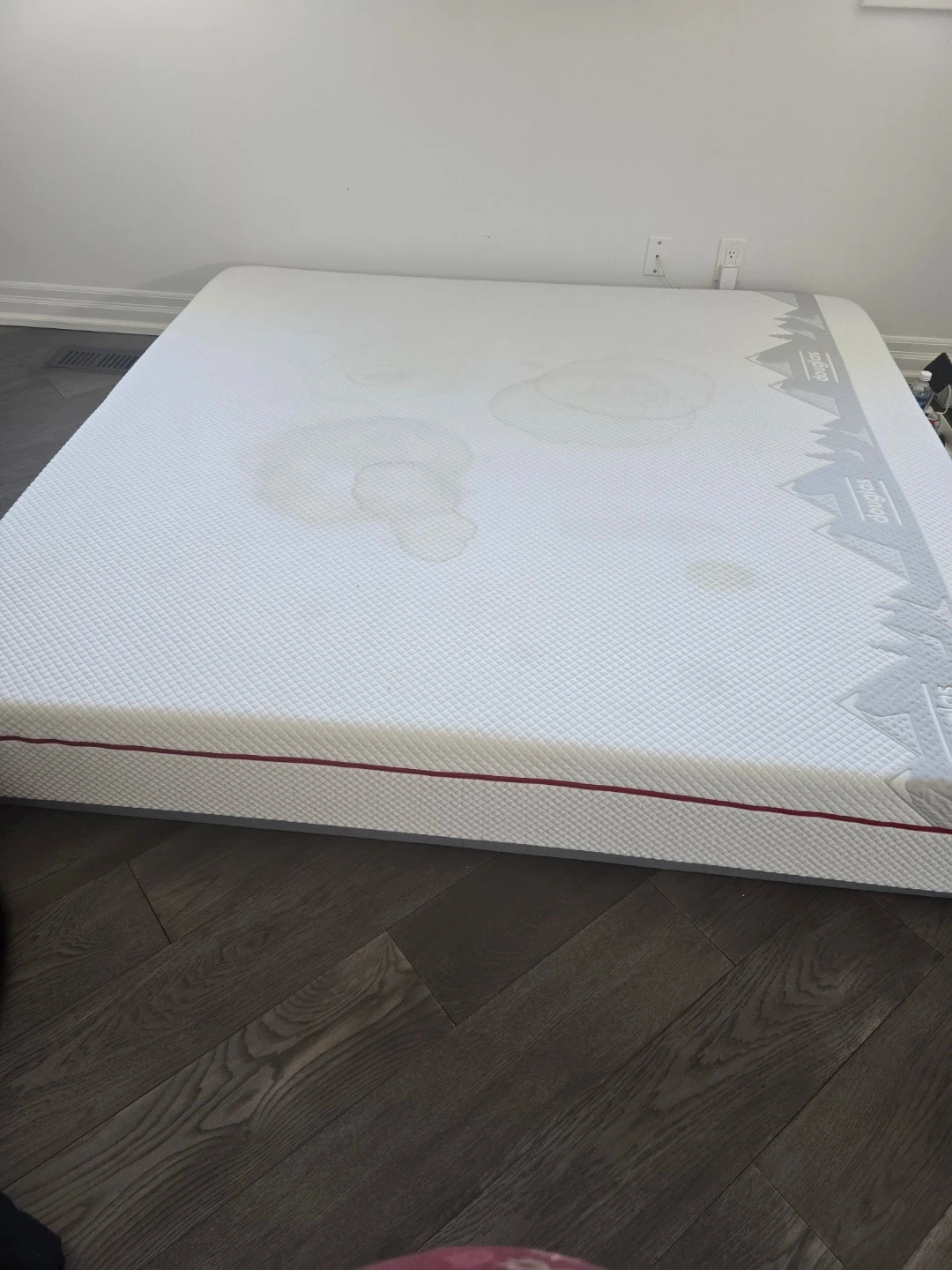 This is a Douglas mattress. It has some stains on the top surface. The brand name is visible along the side. King mattress quick pickup serious people only text