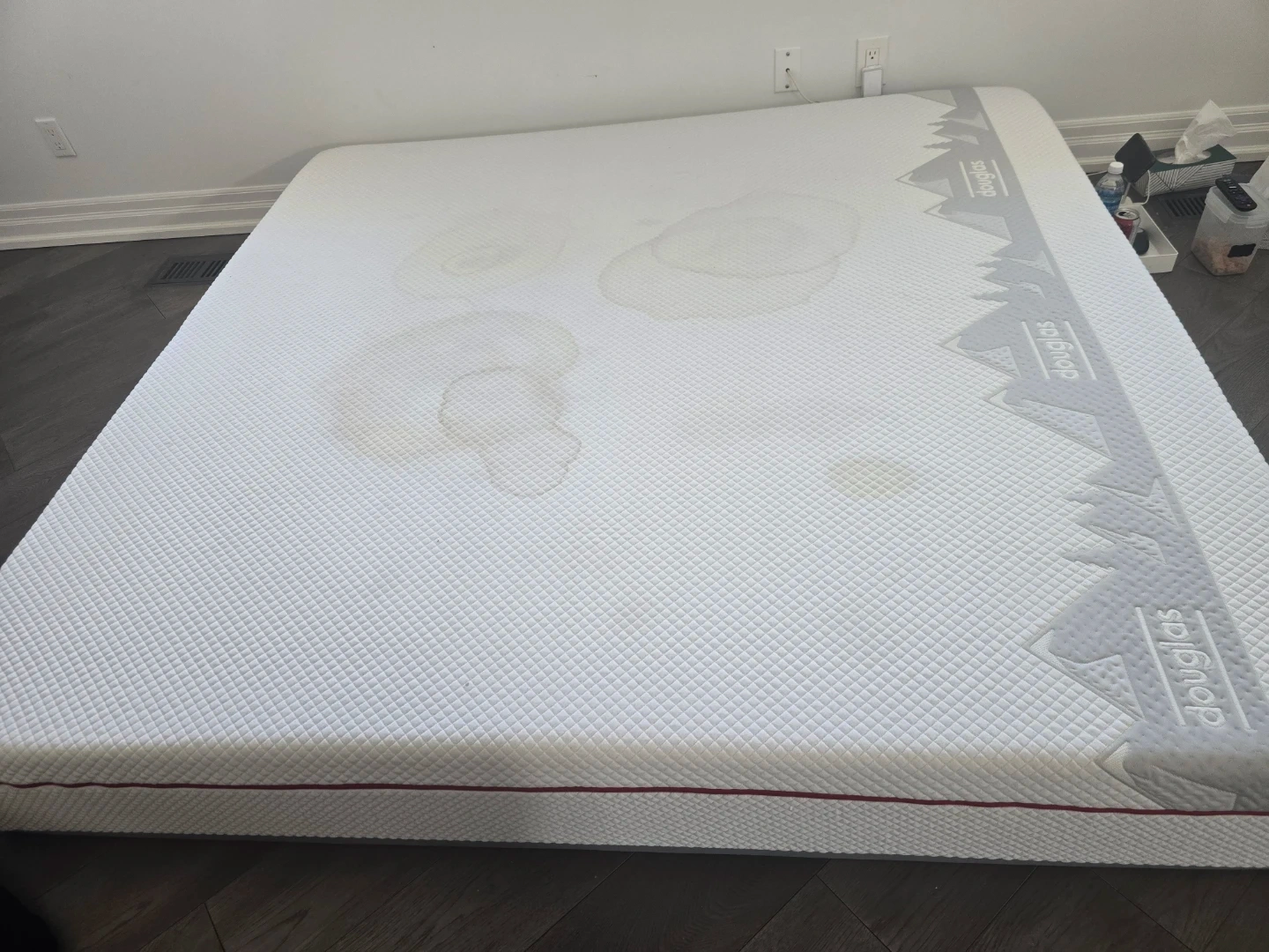 This is a Douglas mattress. It has some stains on the top surface. The brand name is visible along the side. King mattress quick pickup serious people only text