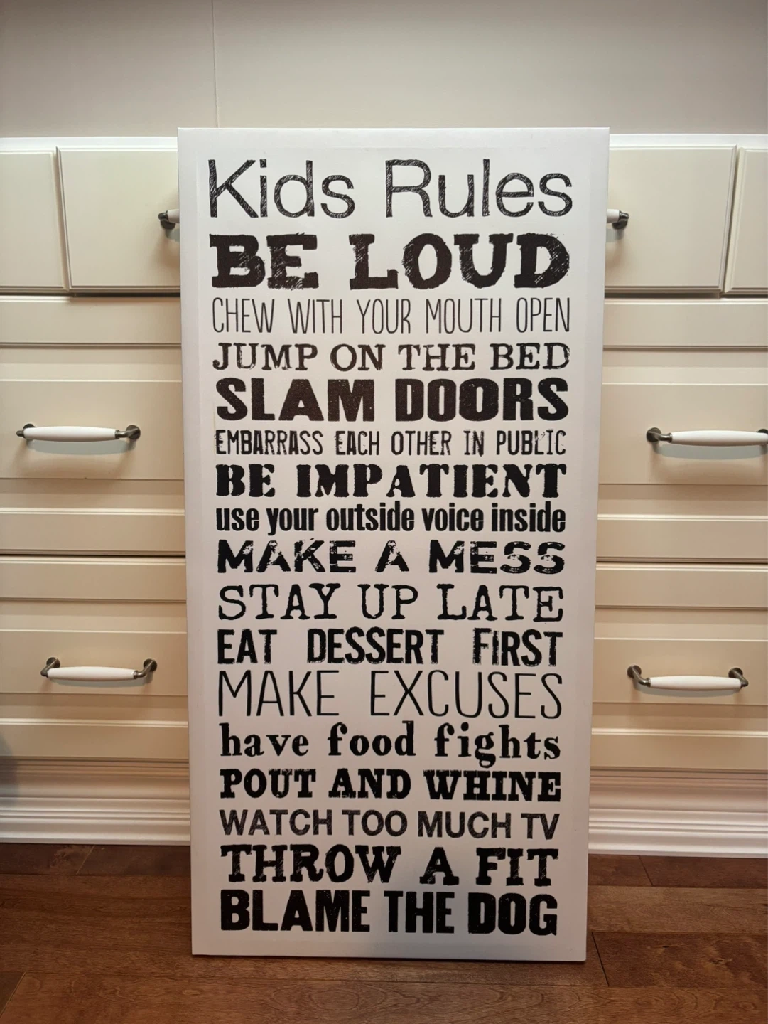 This canvas art lists humorous 'Kids Rules' like 'Be Loud' and 'Jump on the Bed'. It's a fun piece for a family home! The canvas is stretched over a wooden frame.