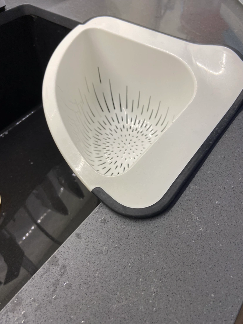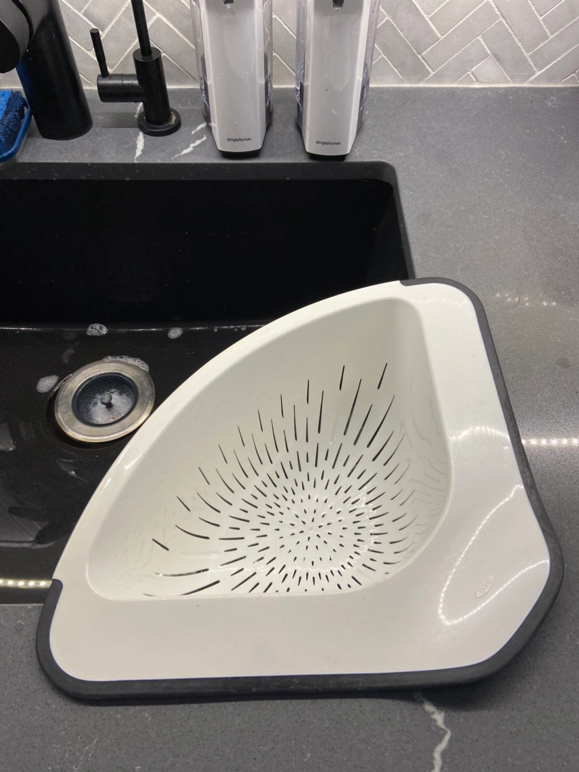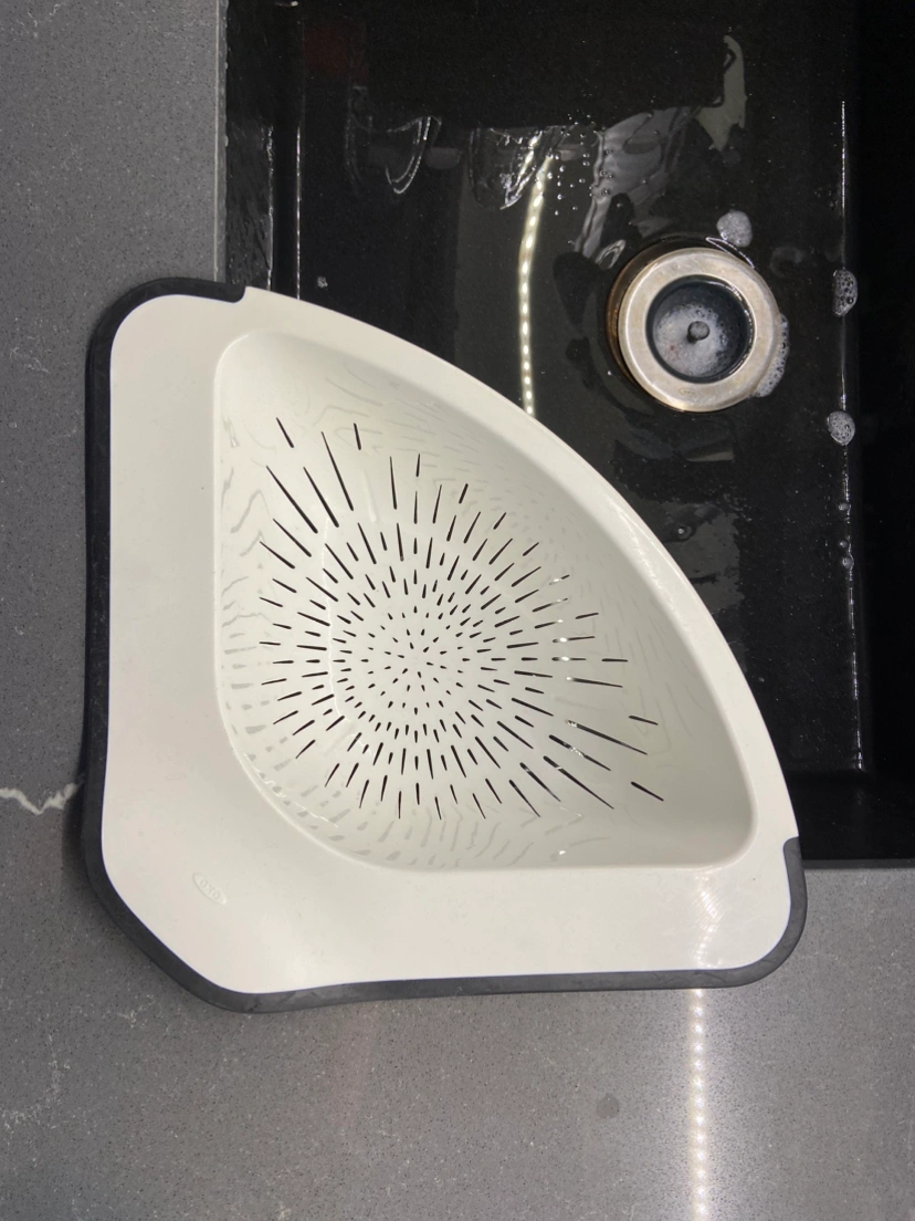 The OXO Good Grips Over the Counter Colander hangs off the sink corner for convenient, space-efficient straining. The wide lip keeps the colander hanging securely and the non-slip lip and soft bumpers protect sink surfaces.