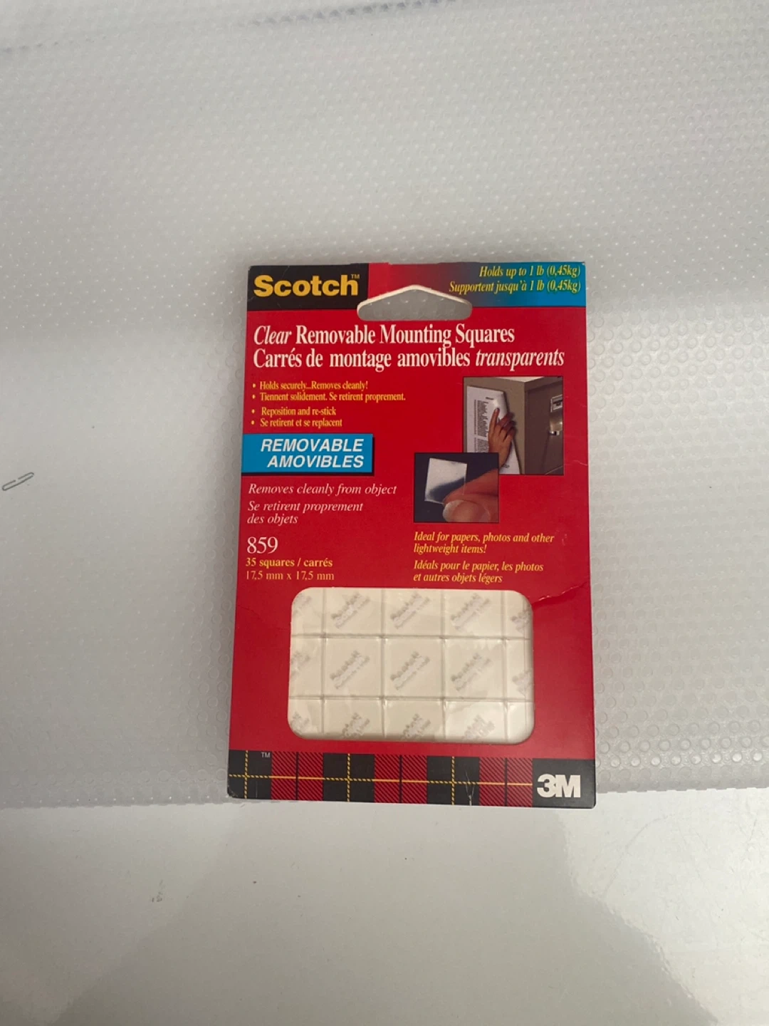 These Scotch mounting squares hold up to 1 lb. They're removable and re-stickable. Includes 35 squares measuring 19.5 mm x 19.5 mm. Ideal for papers, photos, and other lightweight items.
