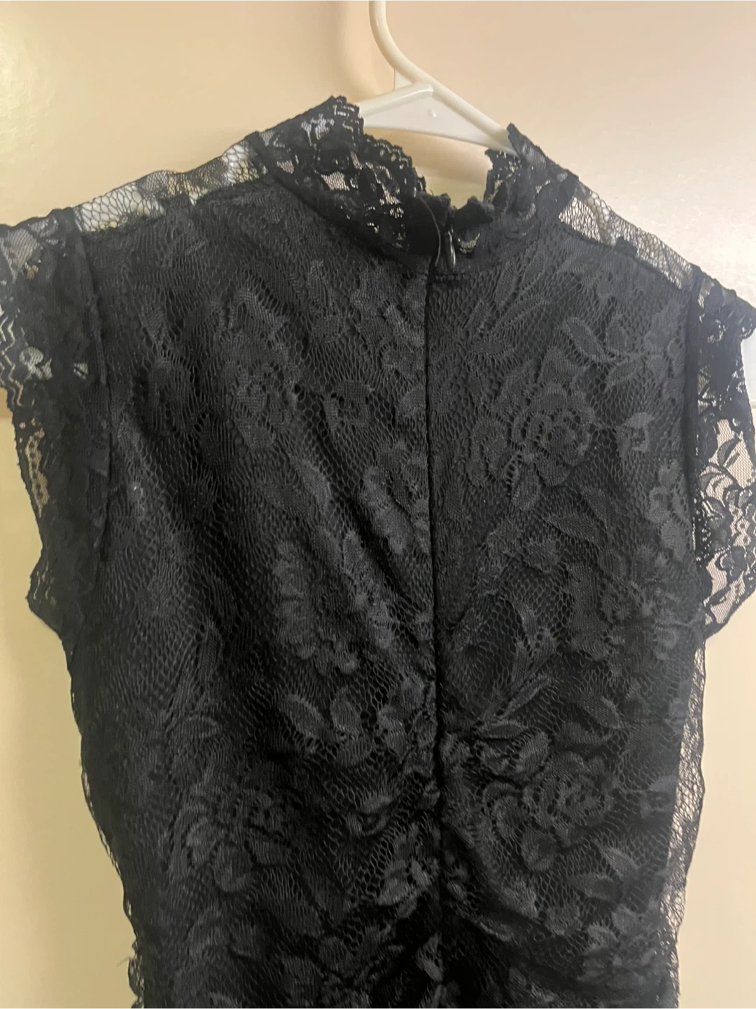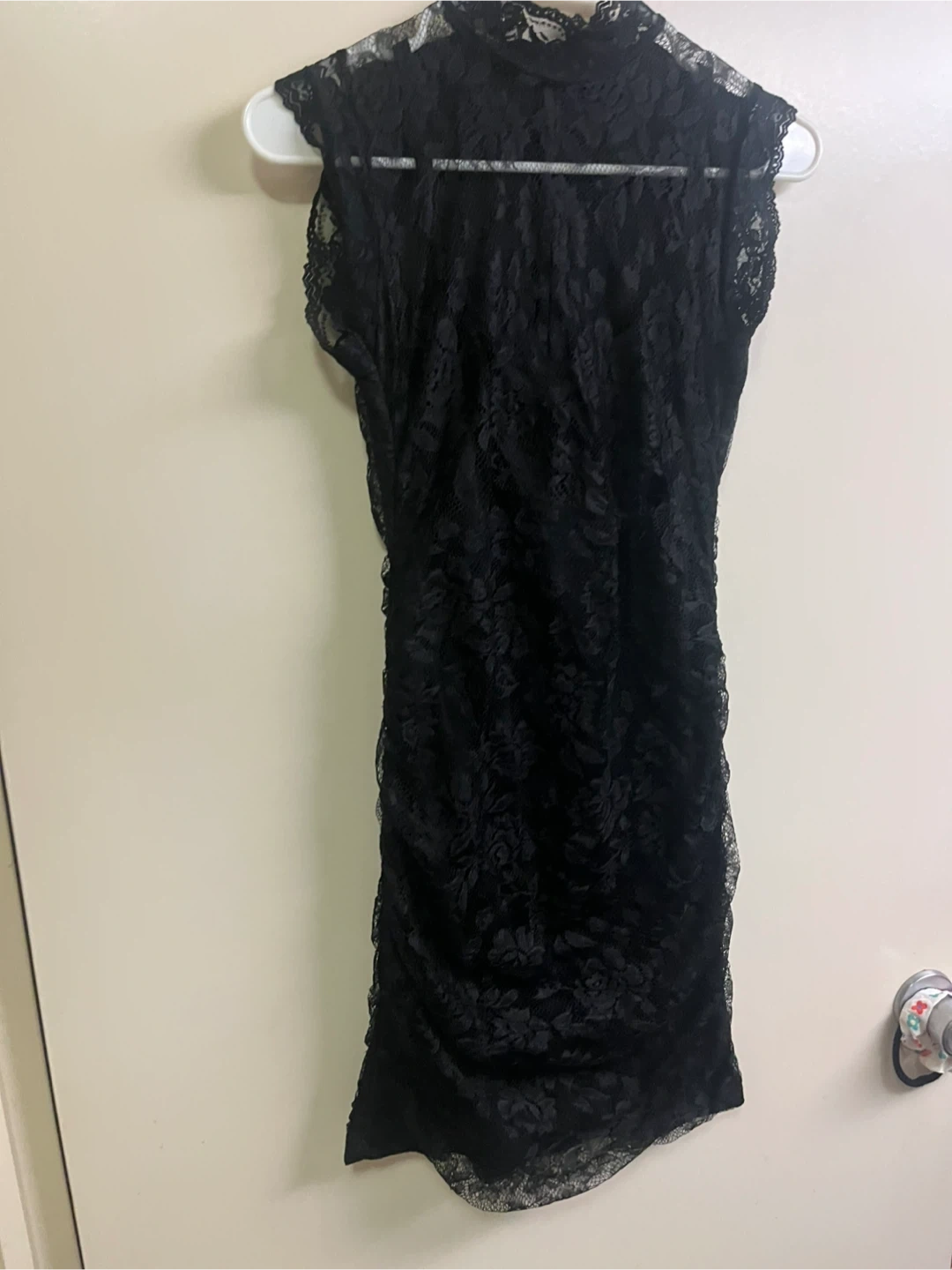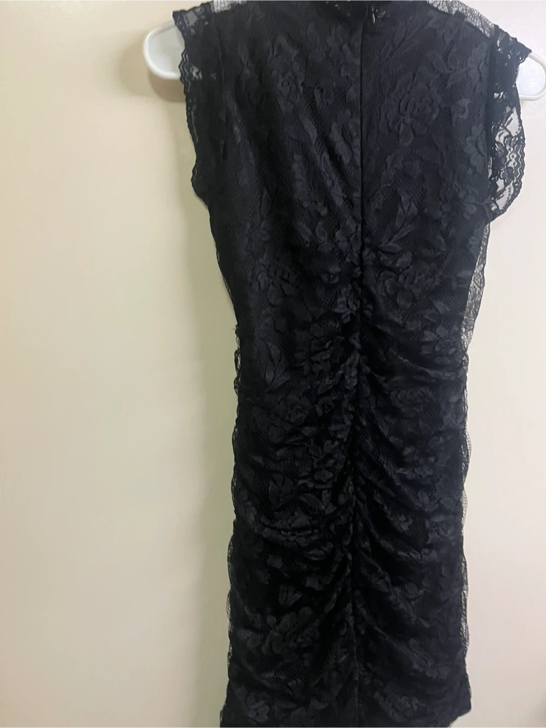 A black lace dress with a high neckline and short sleeves. It features ruching down the sides for a flattering fit. Made of lace, polyester and spandex.