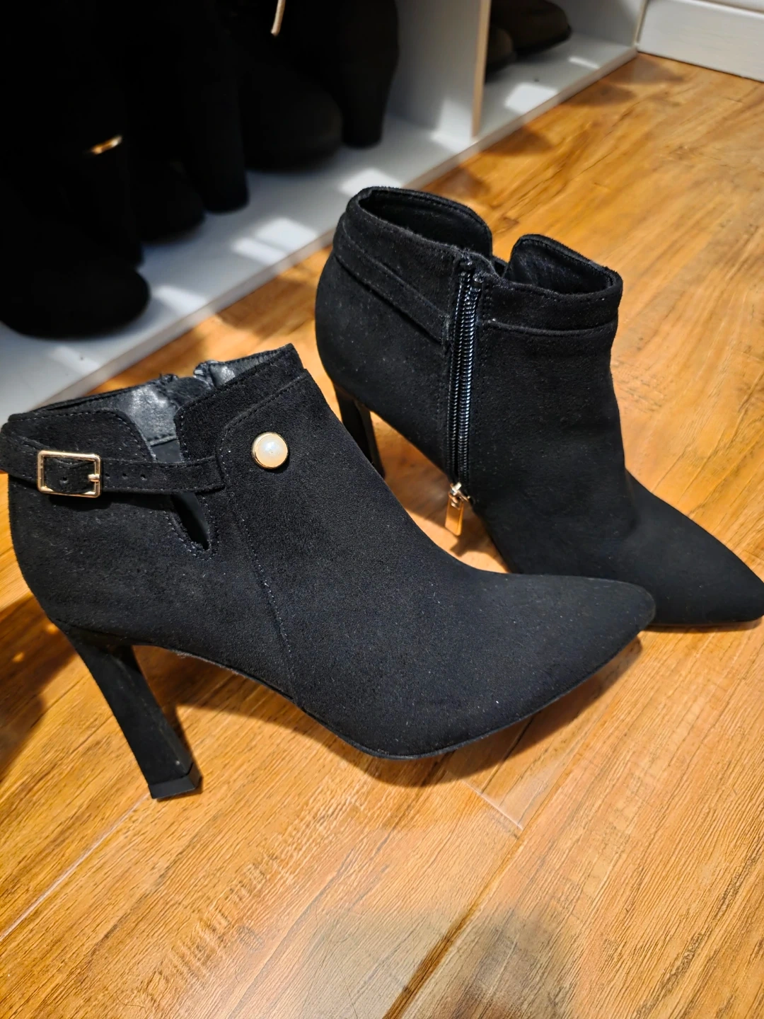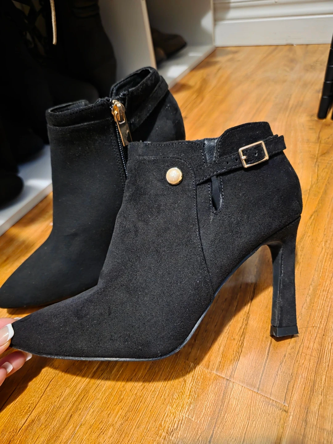 Selling a pair of black heeled ankle boots. They feature a side zipper and a decorative buckle and button. These boots are in great condition and ready for a new owner!