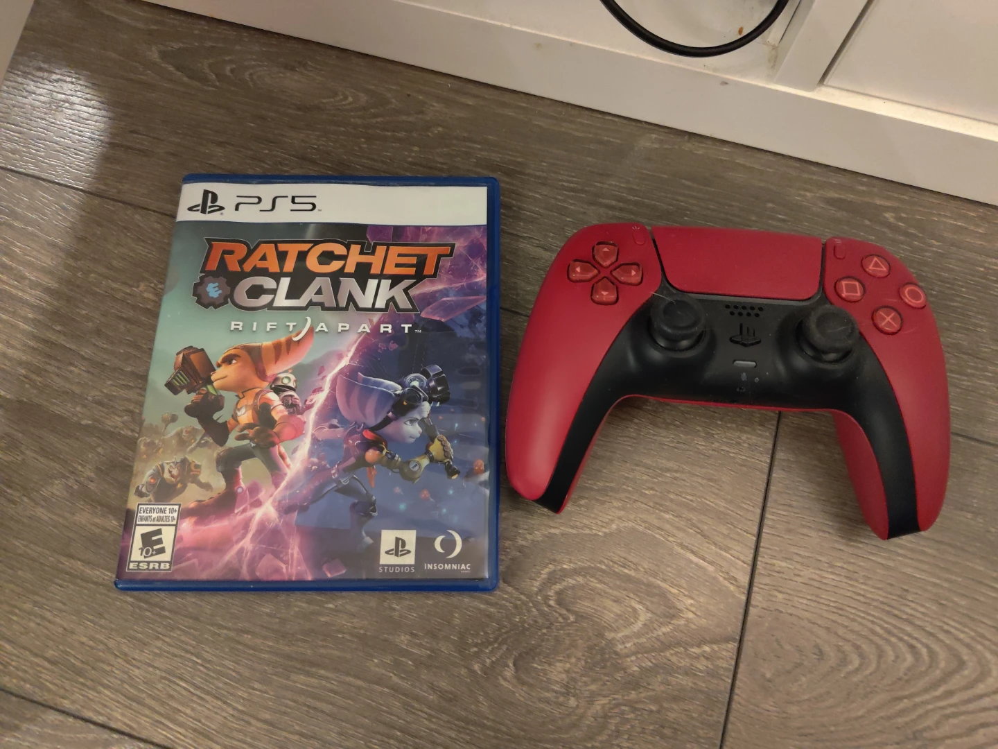 Grab this awesome PS5 game, Ratchet & Clank: Rift Apart, along with a vibrant red DualSense controller. It's a fantastic duo for any PlayStation fan!