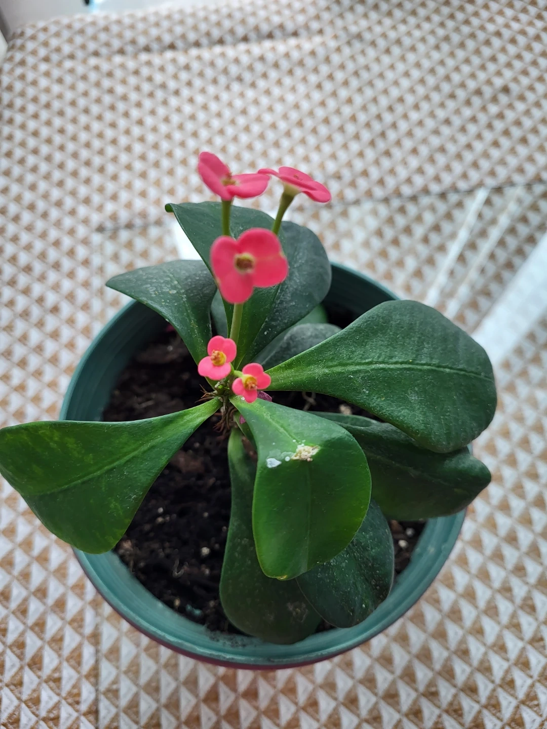 A small potted plant featuring vibrant pink flowers and green leaves. It's in a teal and pink pot with soil. This plant thrives in sunny conditions and is known for its unique blooms.