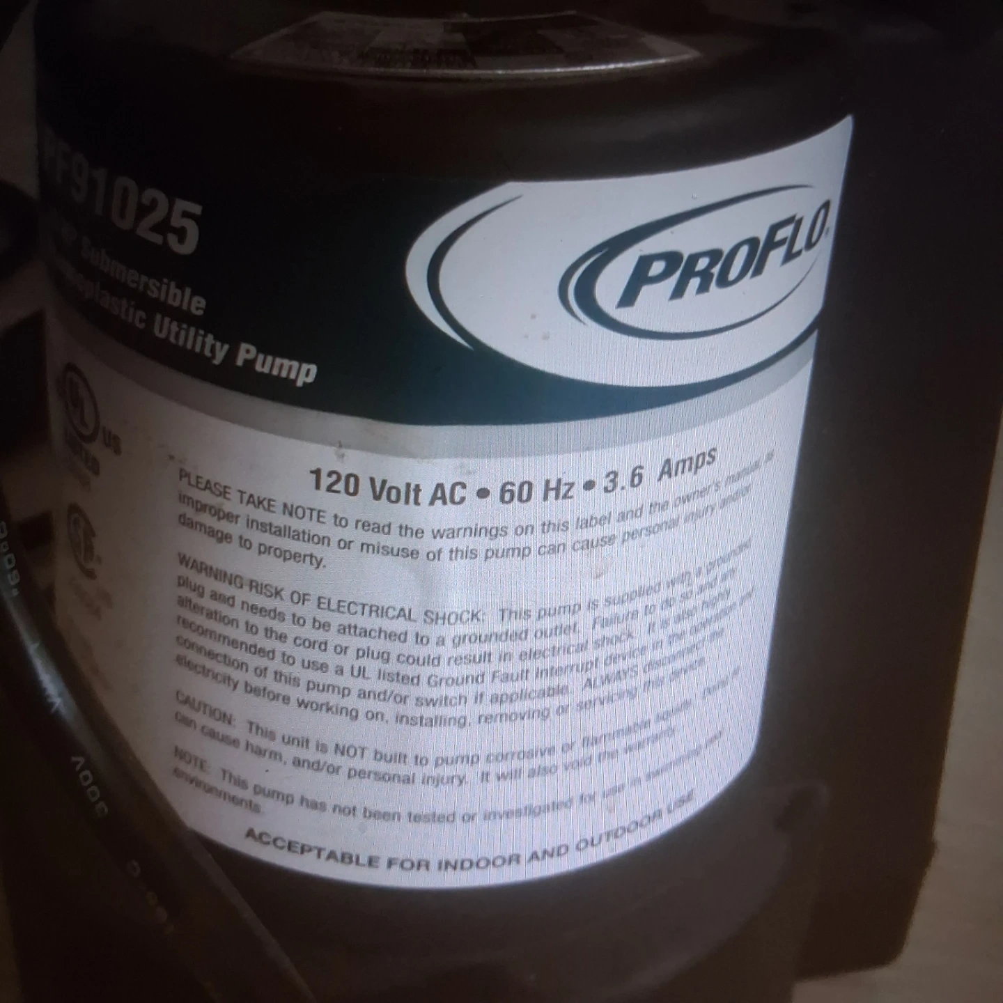 Selling a Proflo submersible plastic utility pump. It's in great shape and ready to go! Operates at 120 Volt AC, 60 Hz, and 3.6 Amps. Perfect for indoor or outdoor use