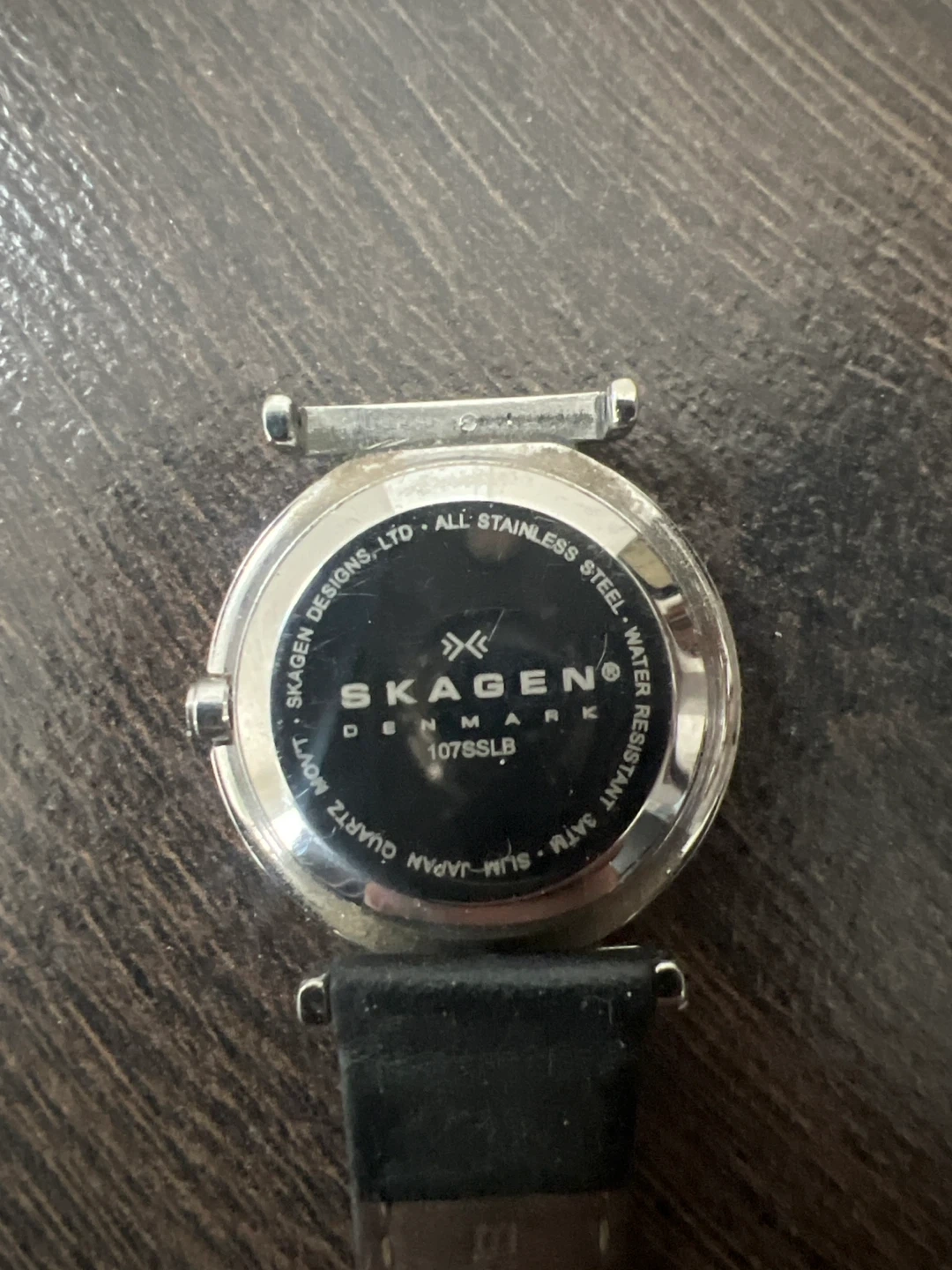 Selling a Skagen Denmark ladies watch. The model number is 107SSLB. It's made of steel and has a black leather band. There are some signs of wear on the watch face.