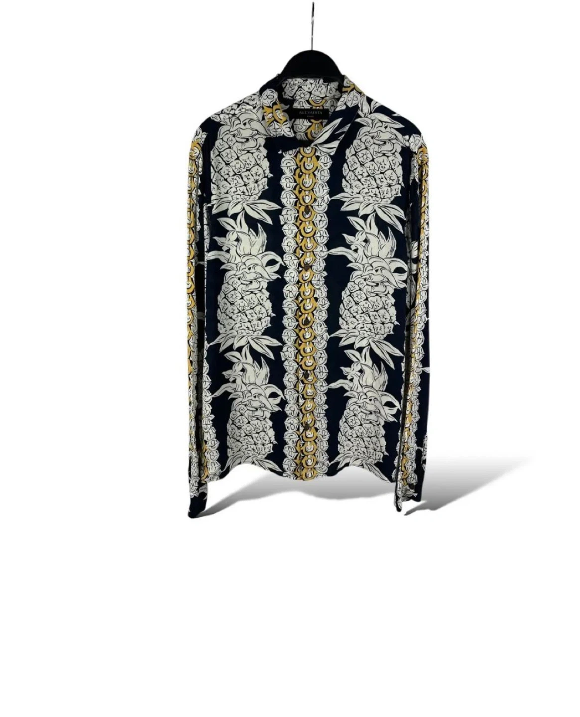 Cool button-up shirt with a fun pineapple and chain link pattern. It's a long-sleeve style with a classic collar and button closure. Great for adding some tropical flair to your outfit!