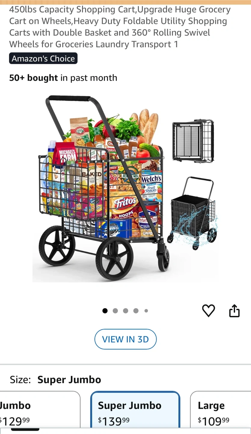 This is a heavy-duty, foldable utility shopping cart with a double basket and 360° rolling swivel wheels. It has a 450lbs capacity and is great for groceries or laundry transport. Size is Super Jumbo.