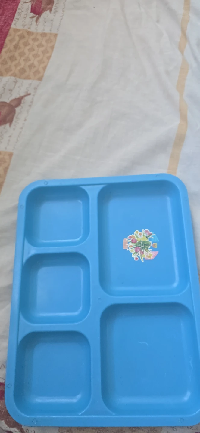 Here's a light blue compartment tray! It is in good condition and has a cute flower sticker on it. Perfect for kids or organizing snacks and meals