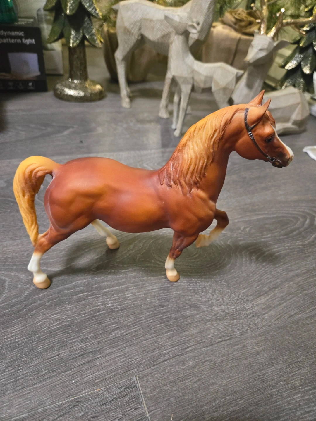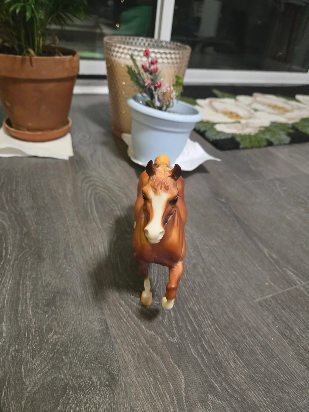 Selling a Breyer horse figurine. He is brown in colour with white markings and blondish hair. It's in good condition and would be a lovely addition to any collection! It's a model of a famous racing horse. Great gift for horse lovers or horse racing fans!