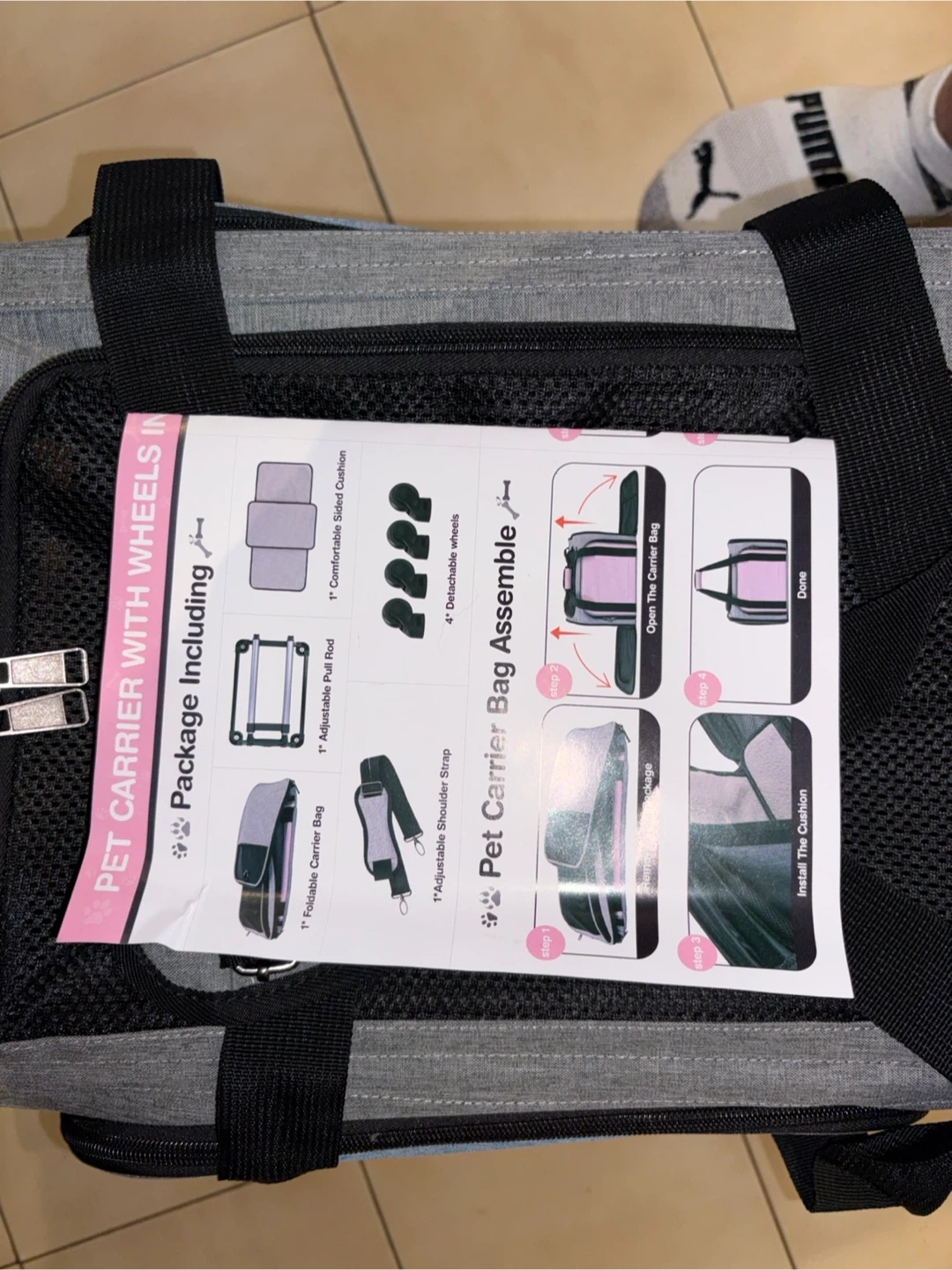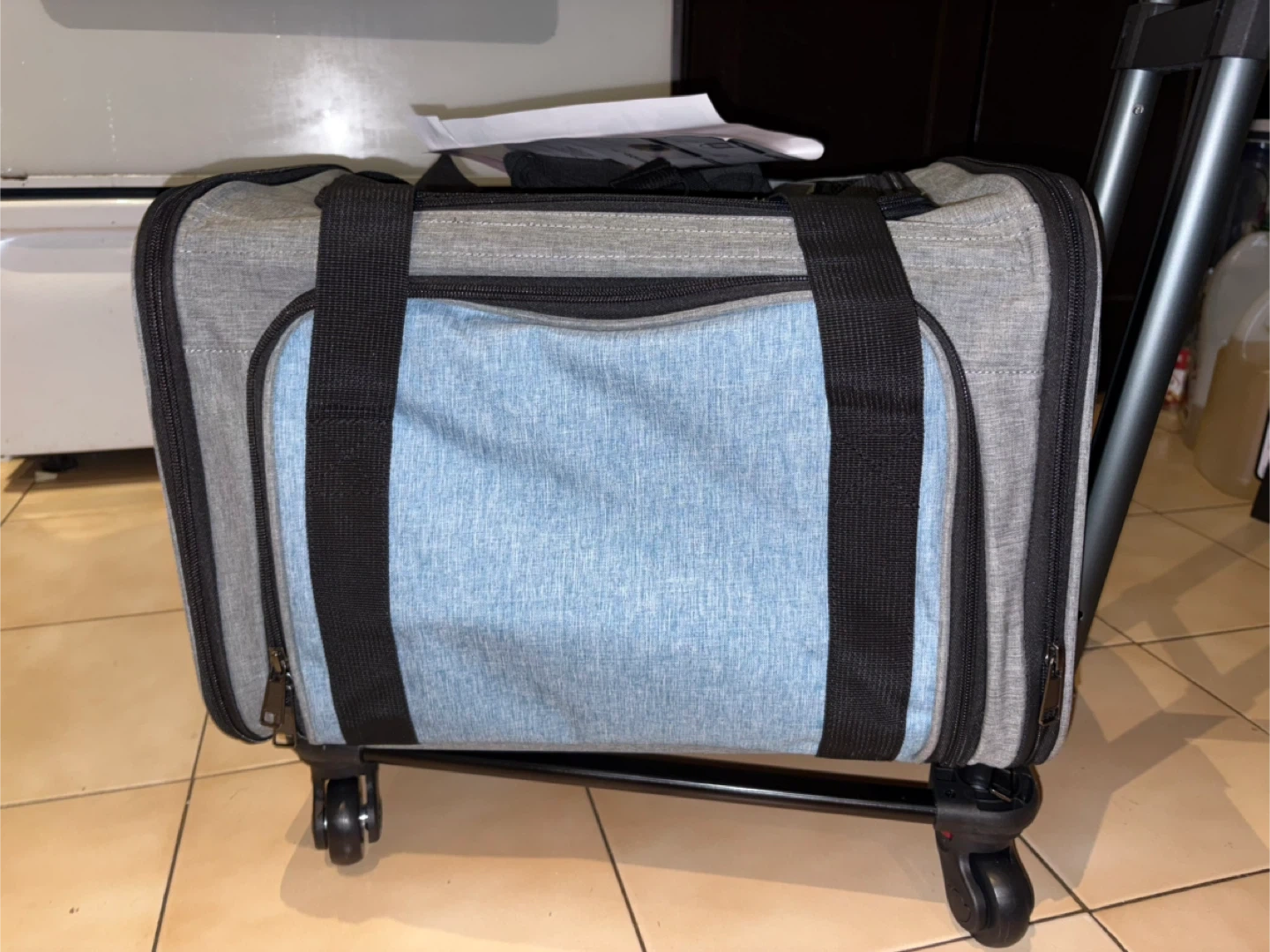 Grey and light blue pet carrier with wheels and a telescoping handle. Includes a foldable carrier bag, adjustable shoulder strap, comfortable padded cushion, and detachable wheels. Easy to assemble and perfect for travel!