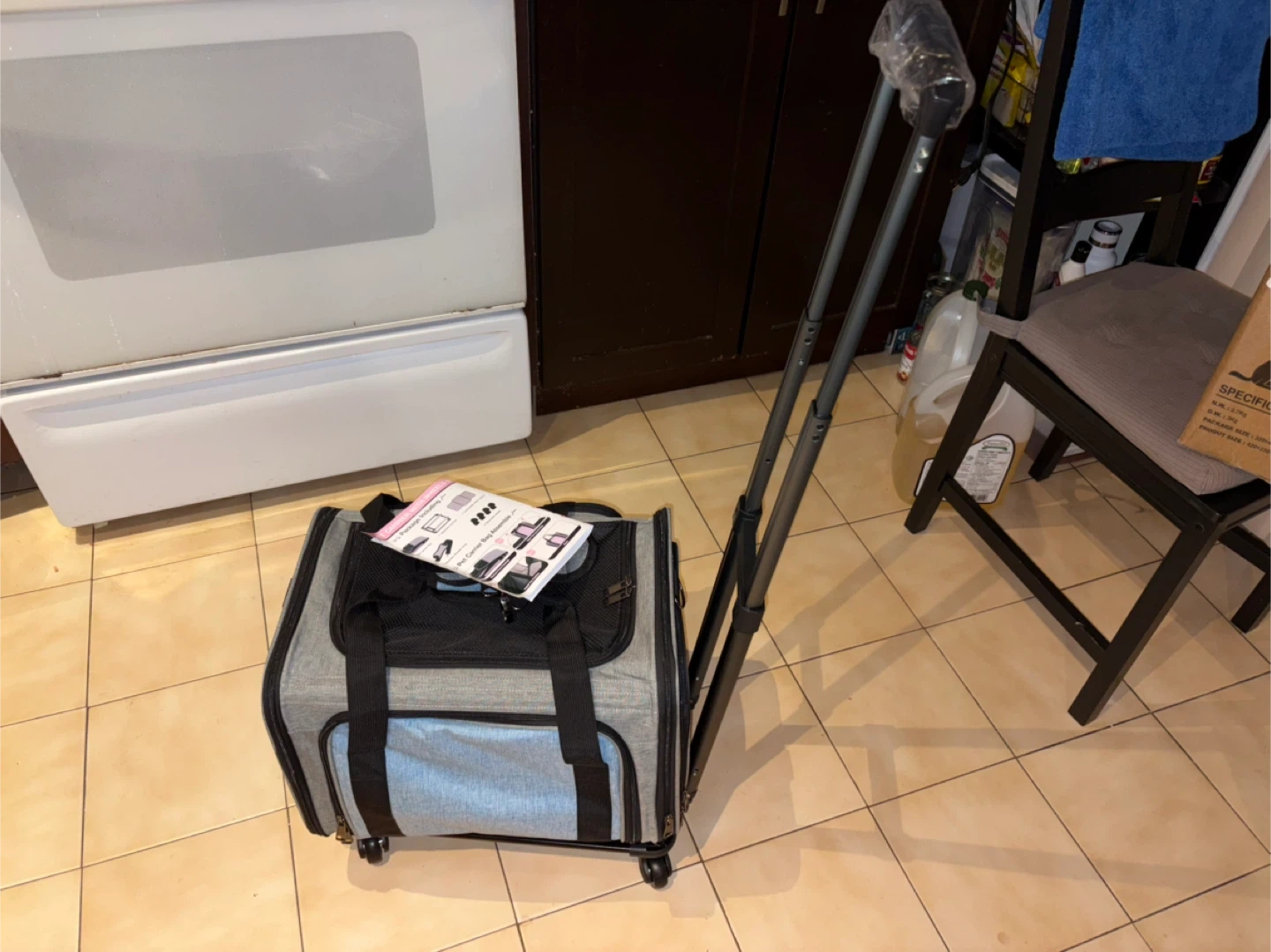 Grey and light blue pet carrier with wheels and a telescoping handle. Includes a foldable carrier bag, adjustable shoulder strap, comfortable padded cushion, and detachable wheels. Easy to assemble and perfect for travel!