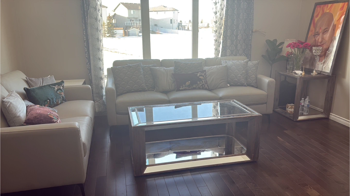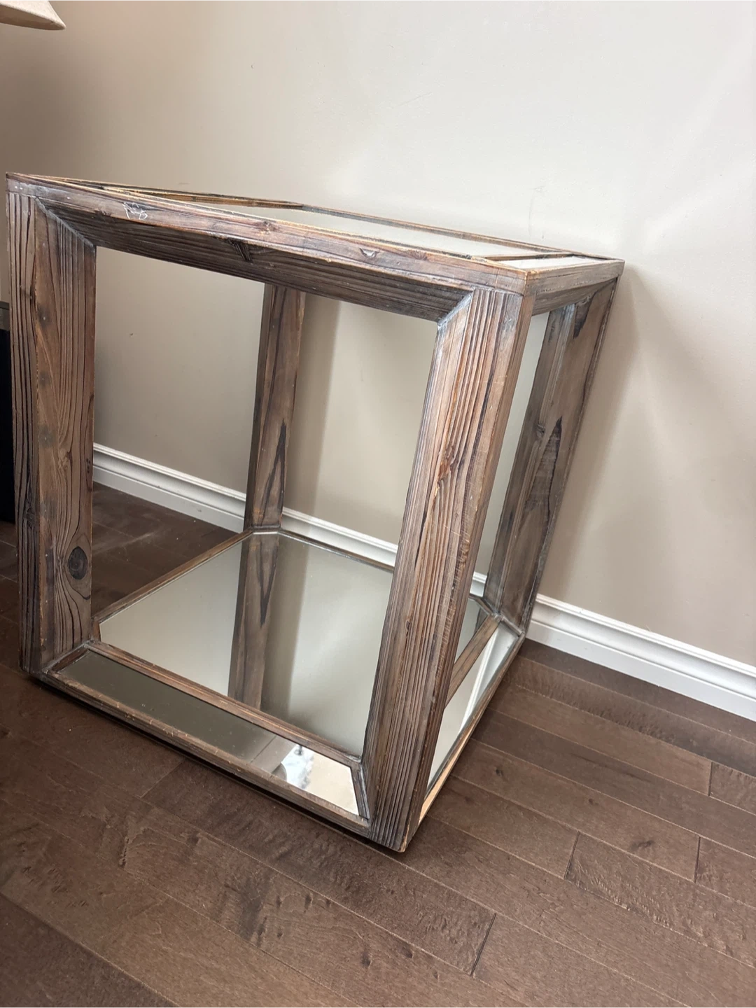 A stylish mirrored coffee table with a wooden frame. It features a spacious top and a lower shelf for storage or display. Great for a living room or den!