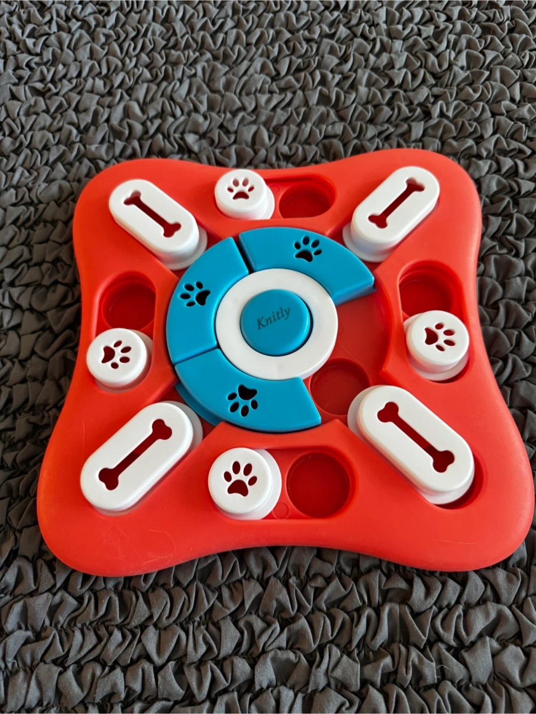 This is a Knily dog treat puzzle toy. It's made of plastic and has multiple compartments for hiding treats. Your dog will love figuring out how to get the treats out!