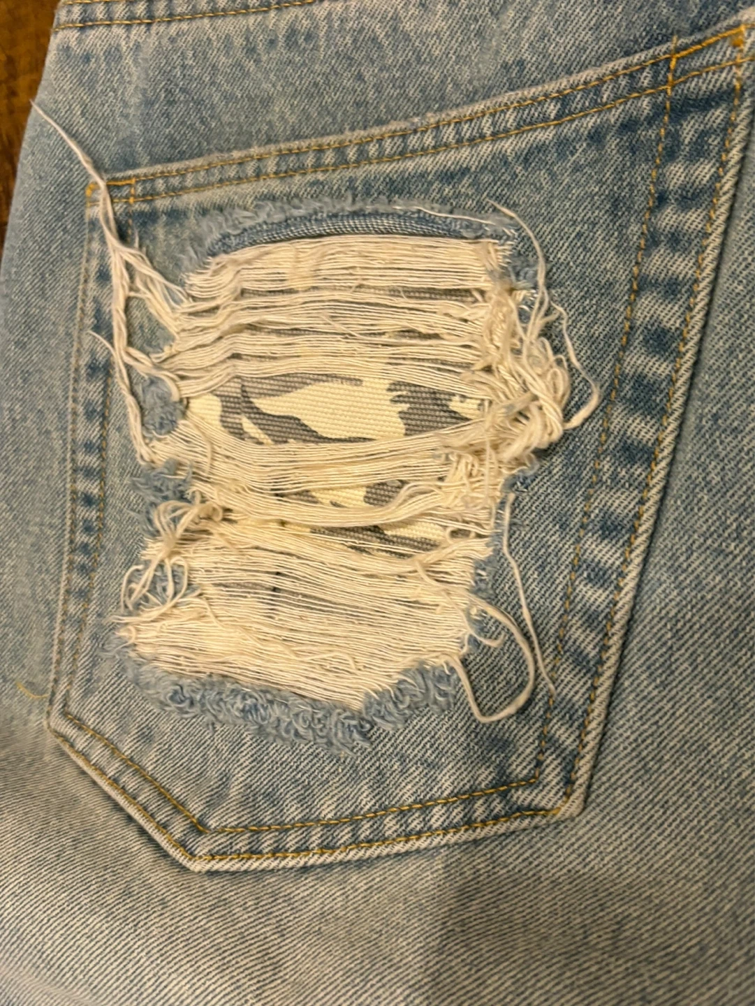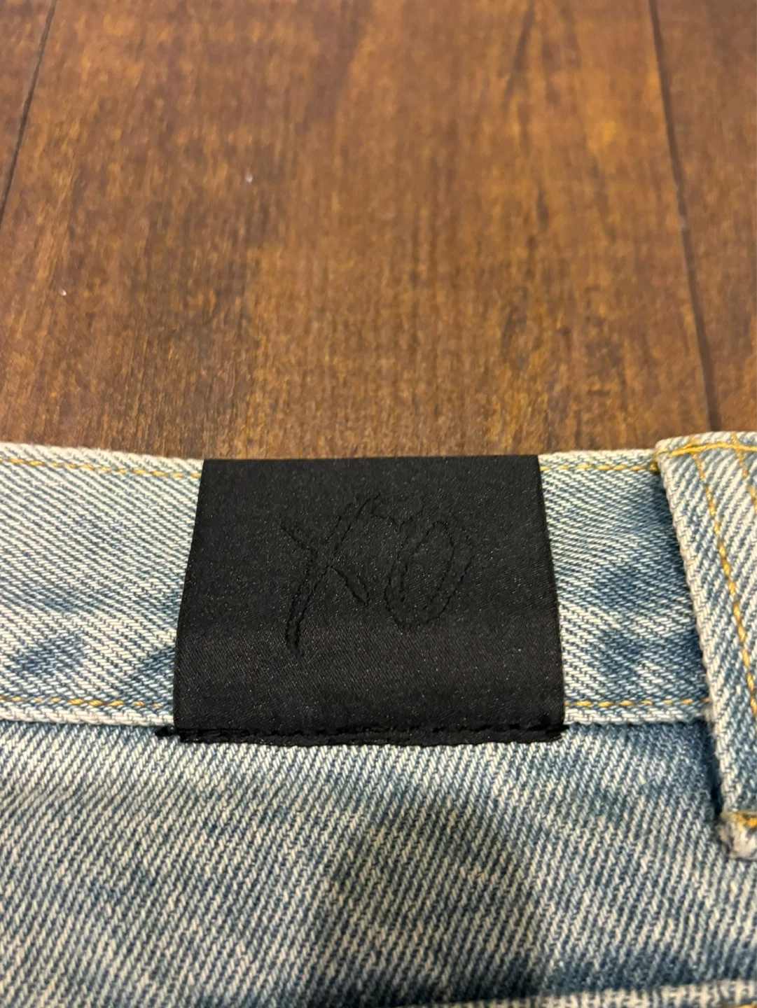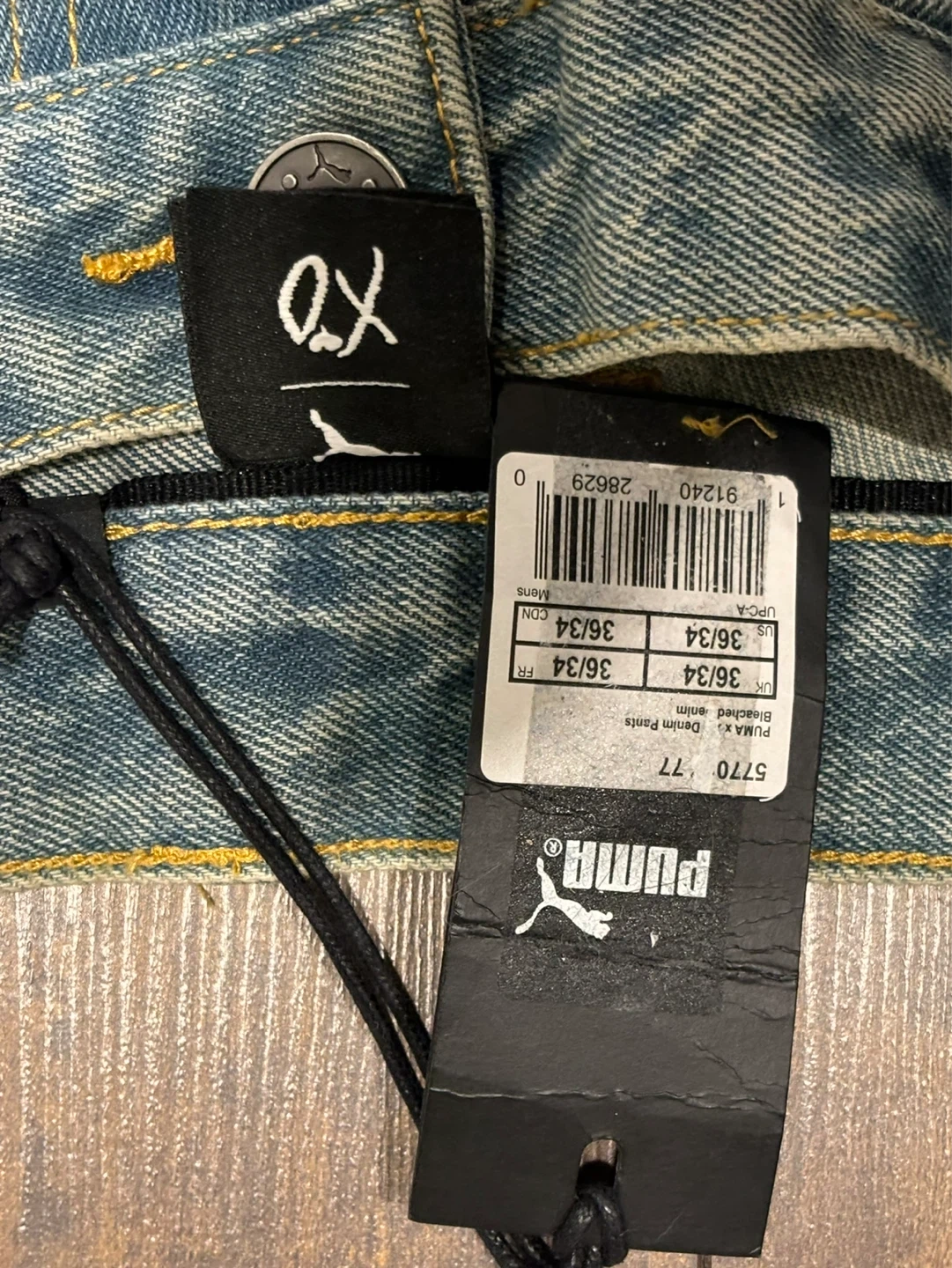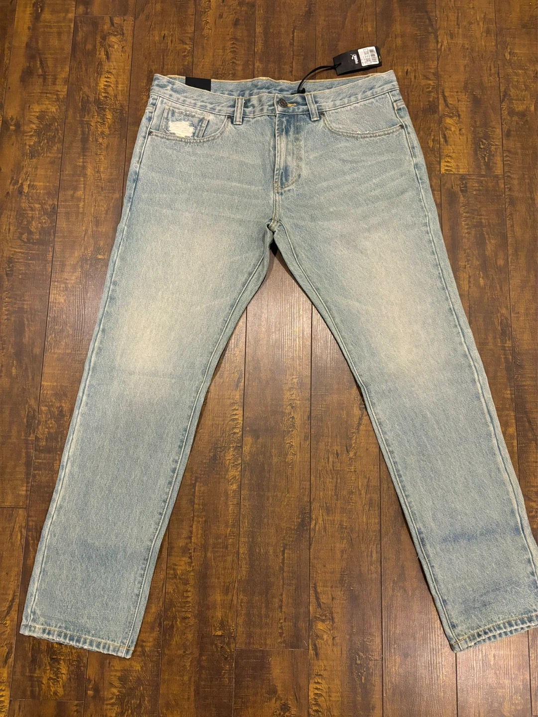 Light wash distressed denim jeans by Puma x XO. Features ripped detailing and a black back pocket. Waist size 36/34.