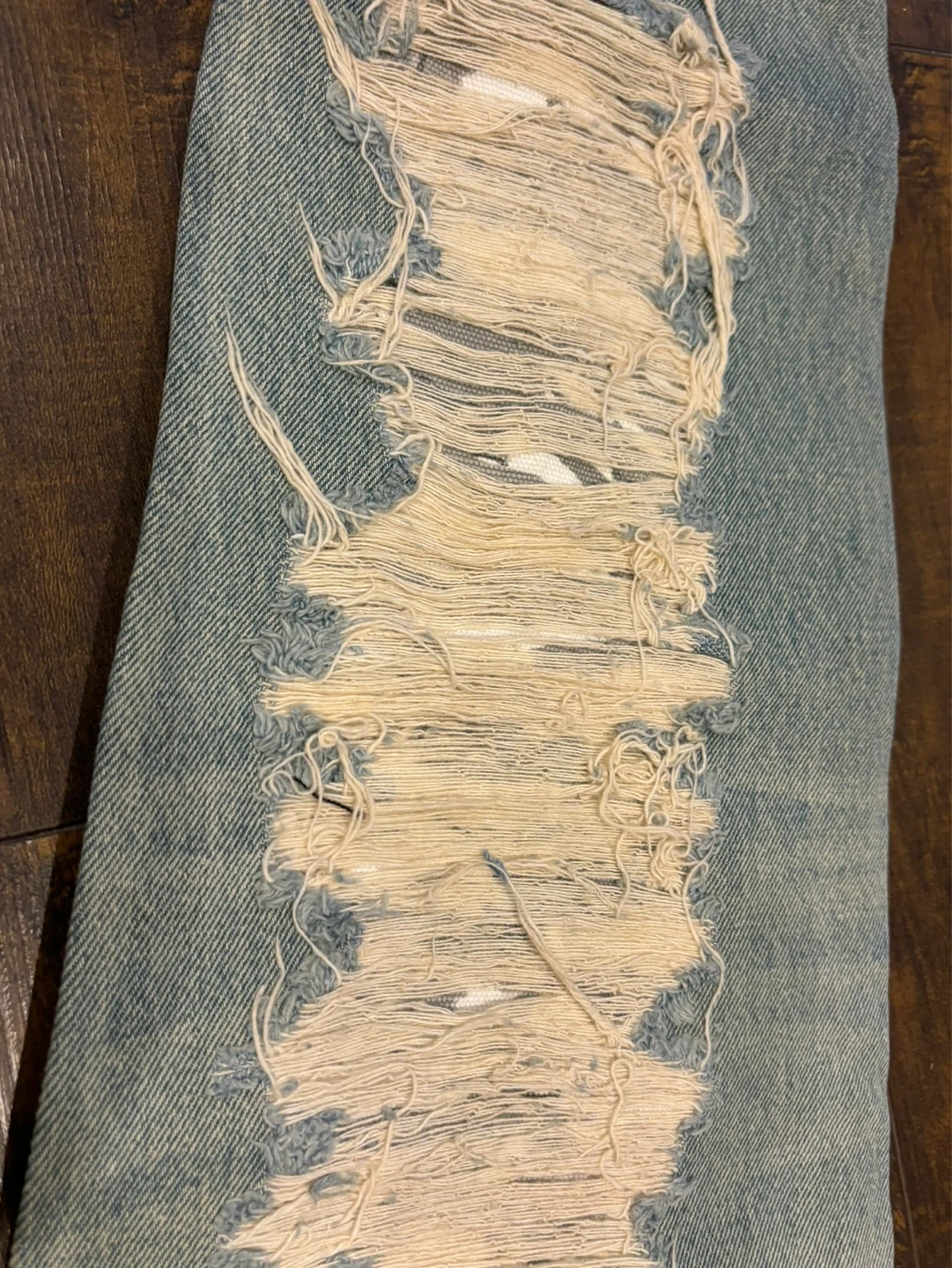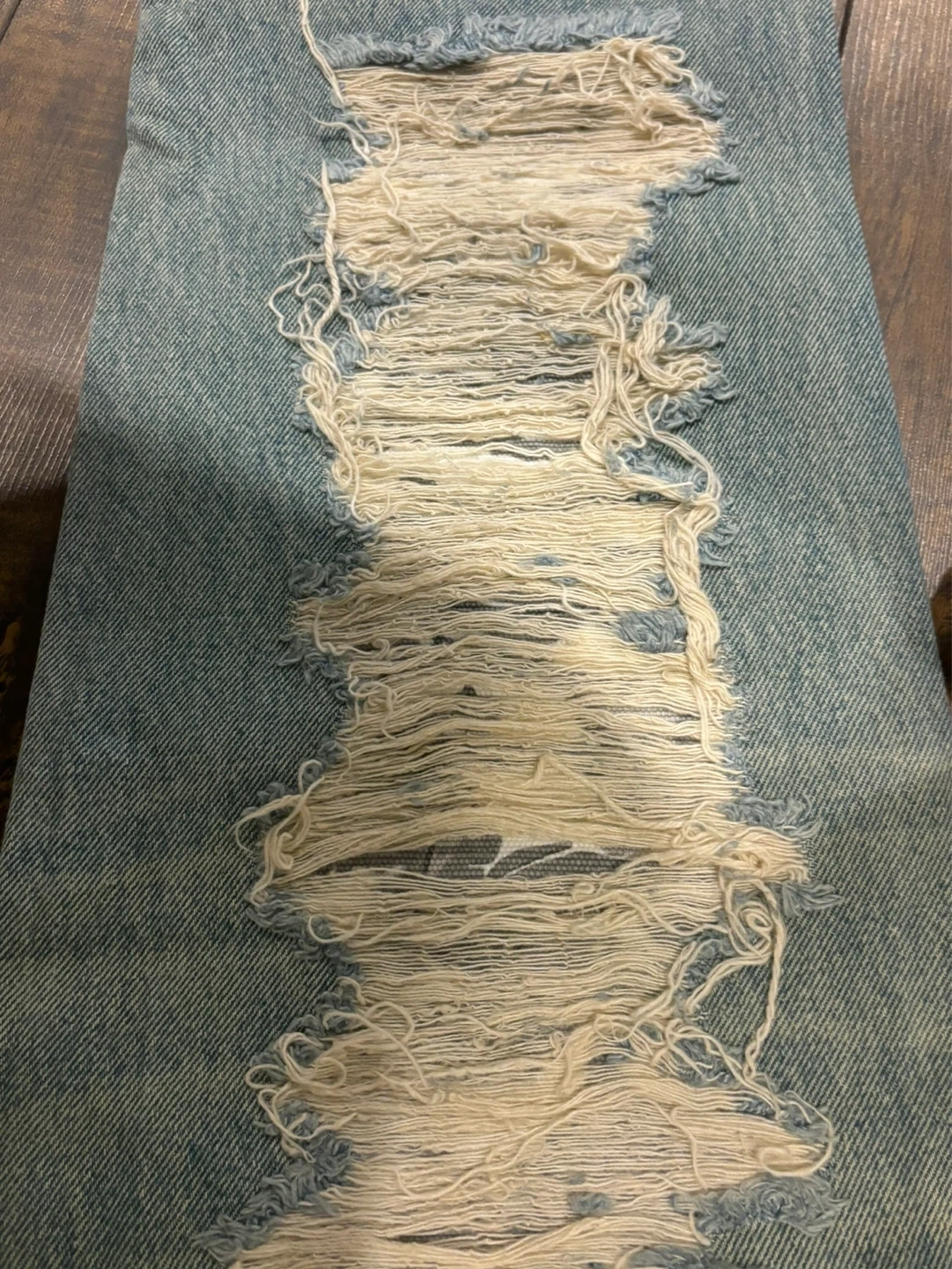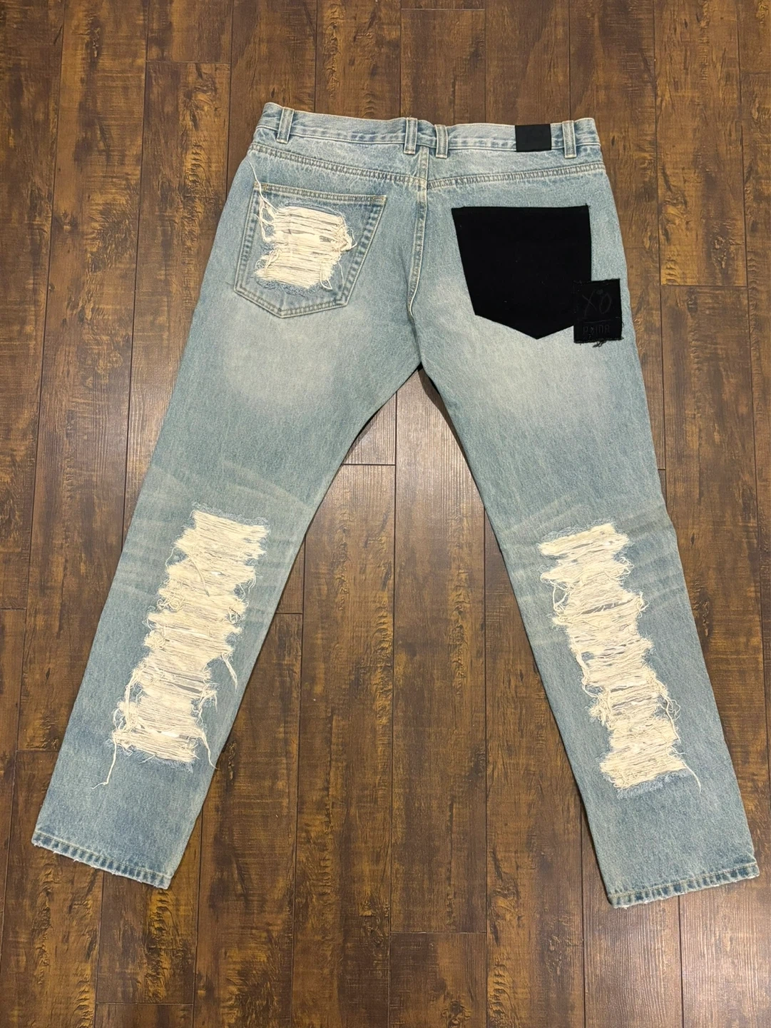 Light wash distressed denim jeans by Puma x XO. Features ripped detailing and a black back pocket. Waist size 36/34.