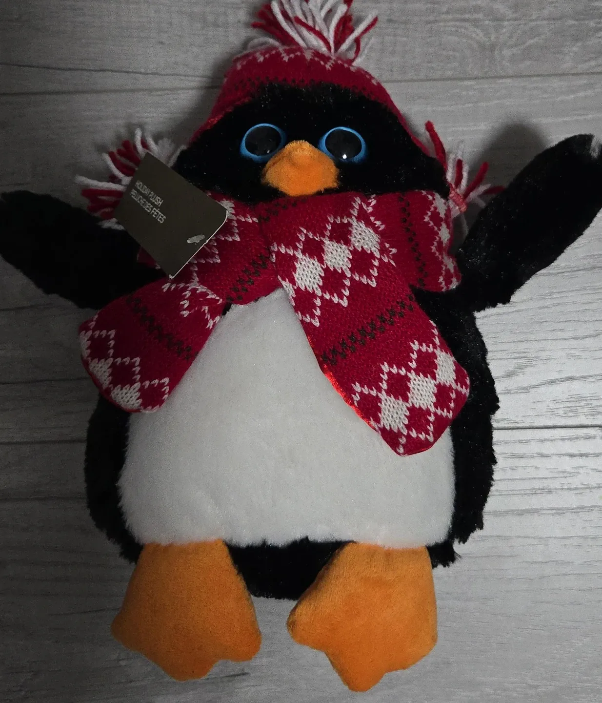 This is a festive holiday plush penguin. It wears a red knitted hat with white fringe and a matching scarf patterned with white snowflakes. The penguin has big blue eyes and orange feet.
