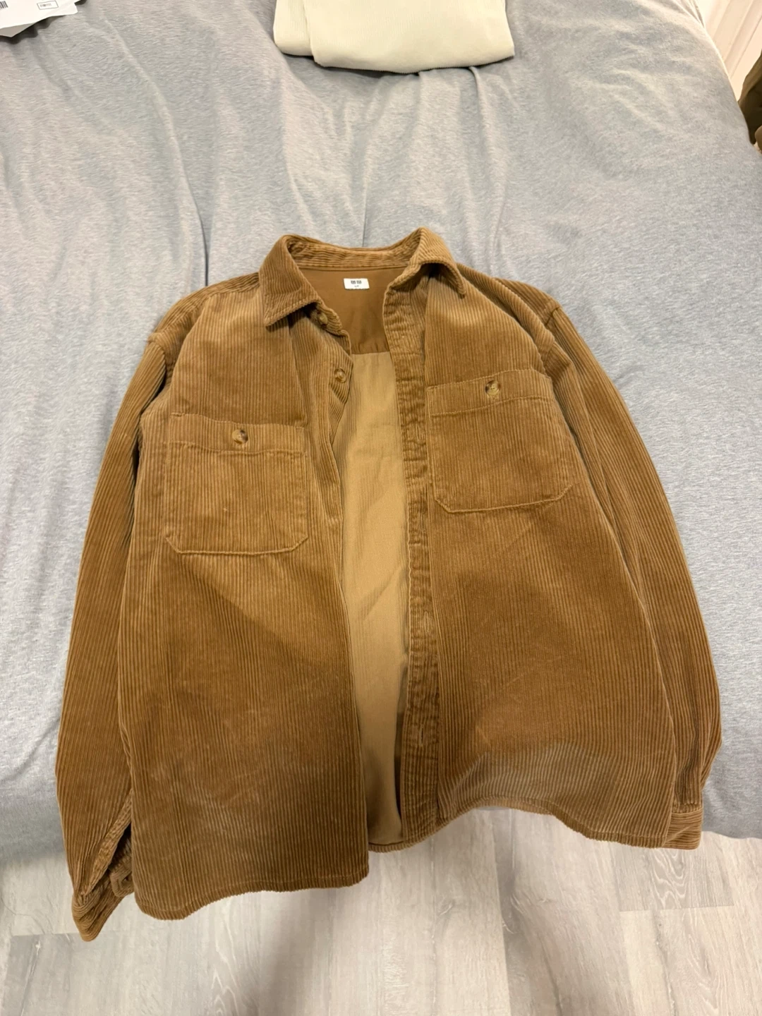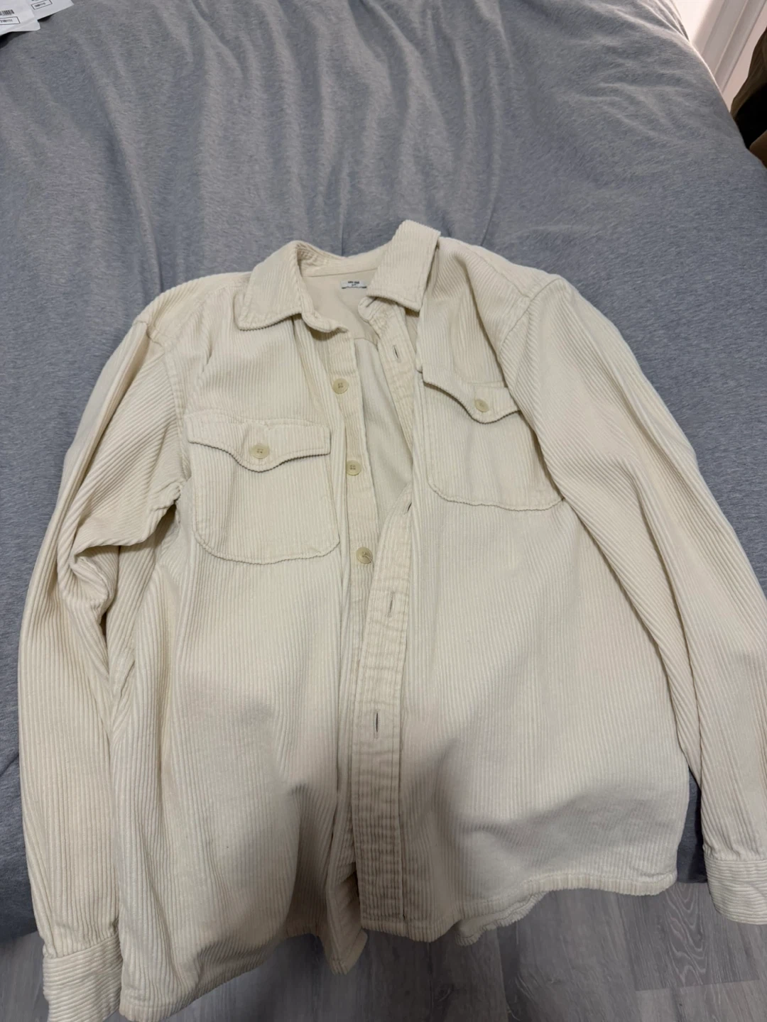 Bundle includes two corduroy shirts, a waffle knit long sleeve shirt, and a utility-style jacket. All items are in good condition and ready for a new wardrobe. This collection offers versatile layering options for cooler weather.