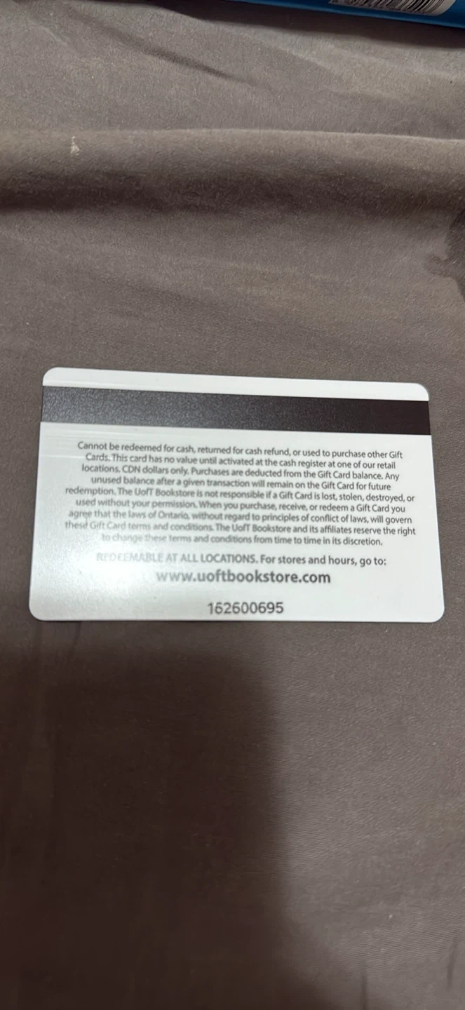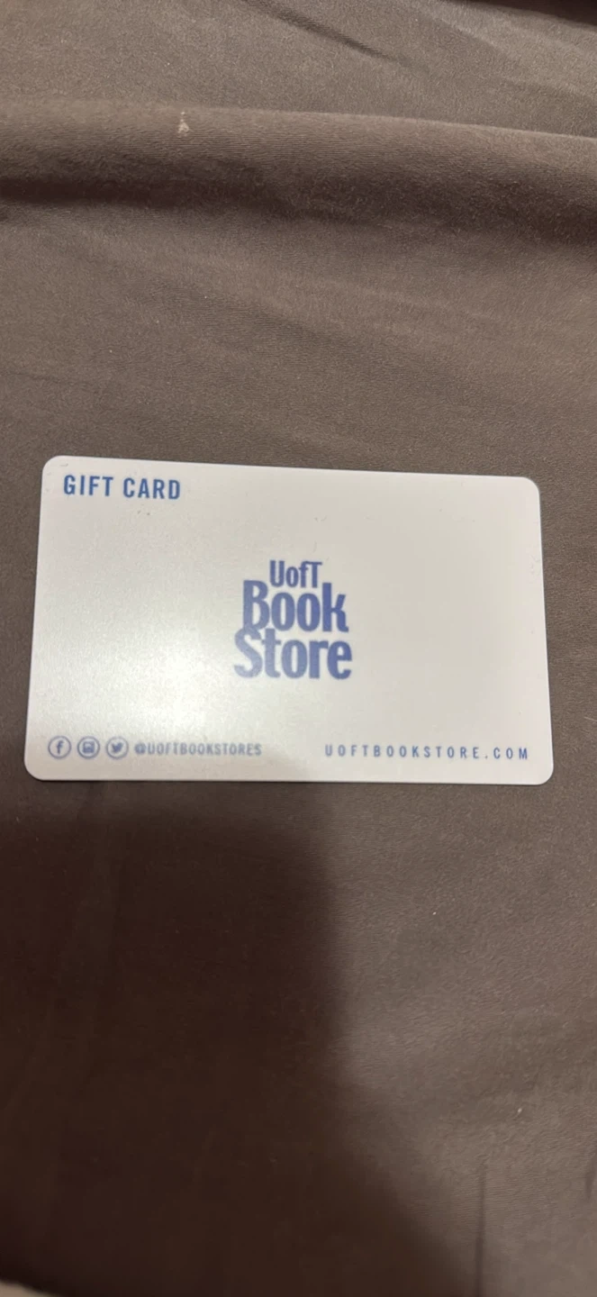 This is a U of T Bookstore gift card. It can be redeemed at all locations for merchandise. Visit www.uoftbookstore.com for store hours and details.