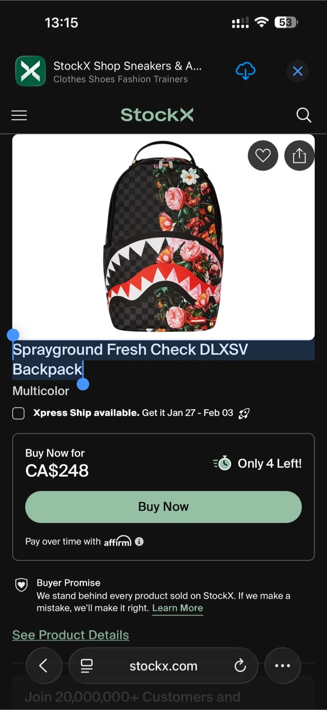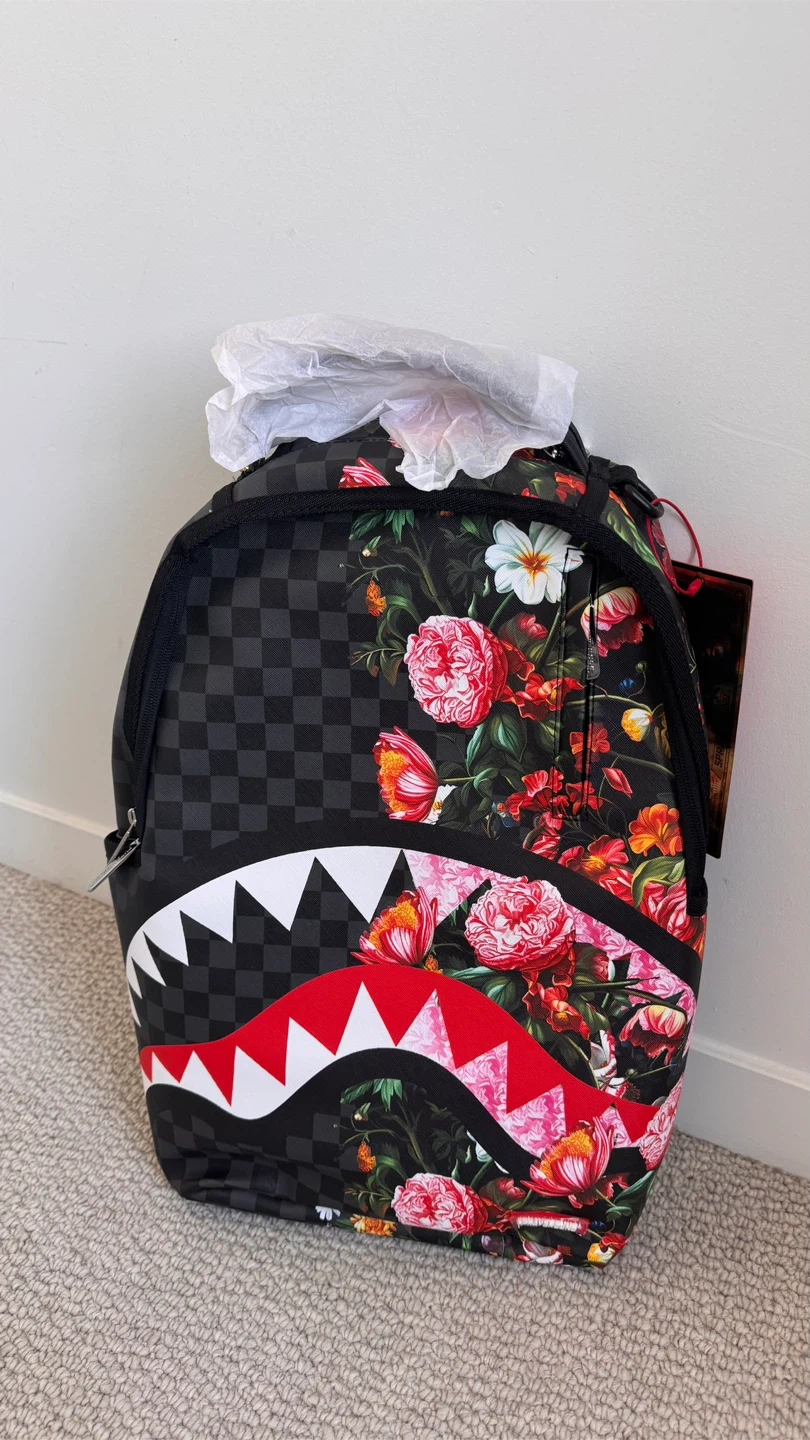 Sprayground backpack with a fresh check and floral design. It features a shark mouth graphic. Adjustable straps are present for comfort. This bag is multicolour.