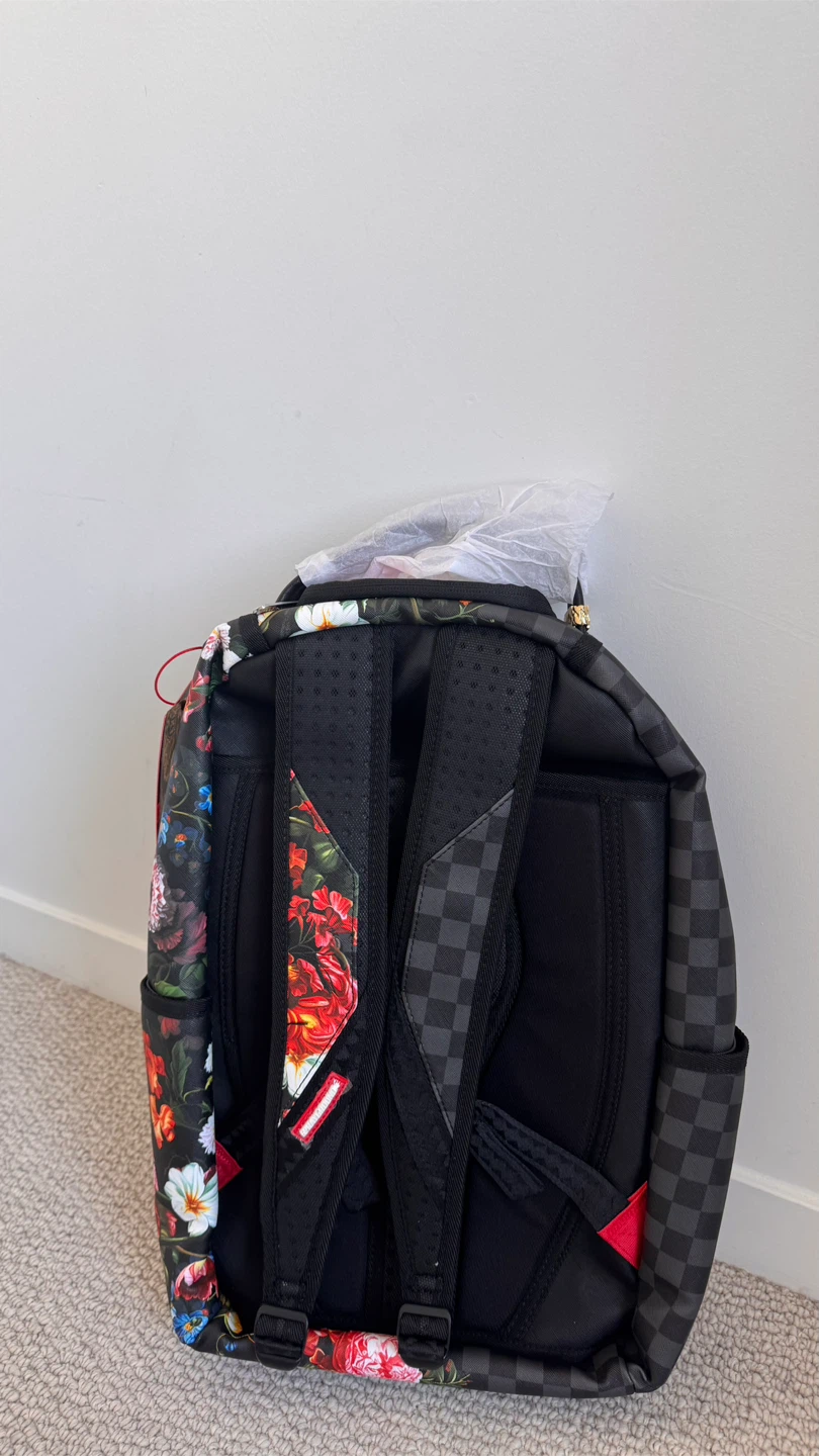 Sprayground backpack with a fresh check and floral design. It features a shark mouth graphic. Adjustable straps are present for comfort. This bag is multicolour.