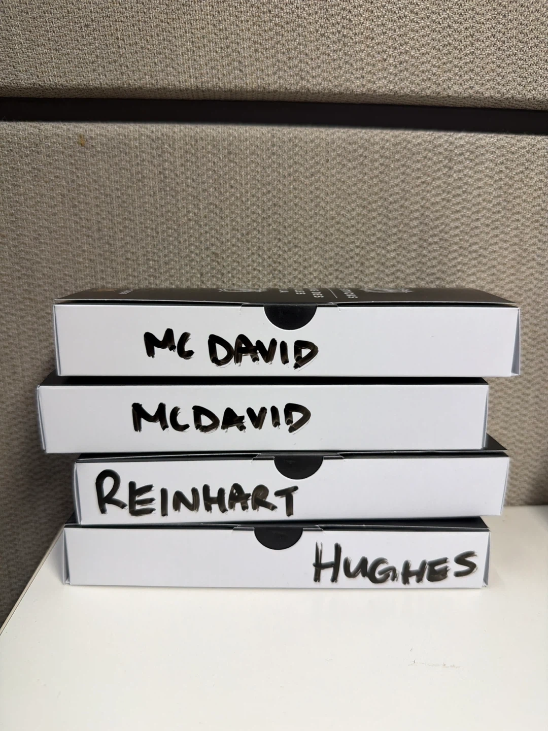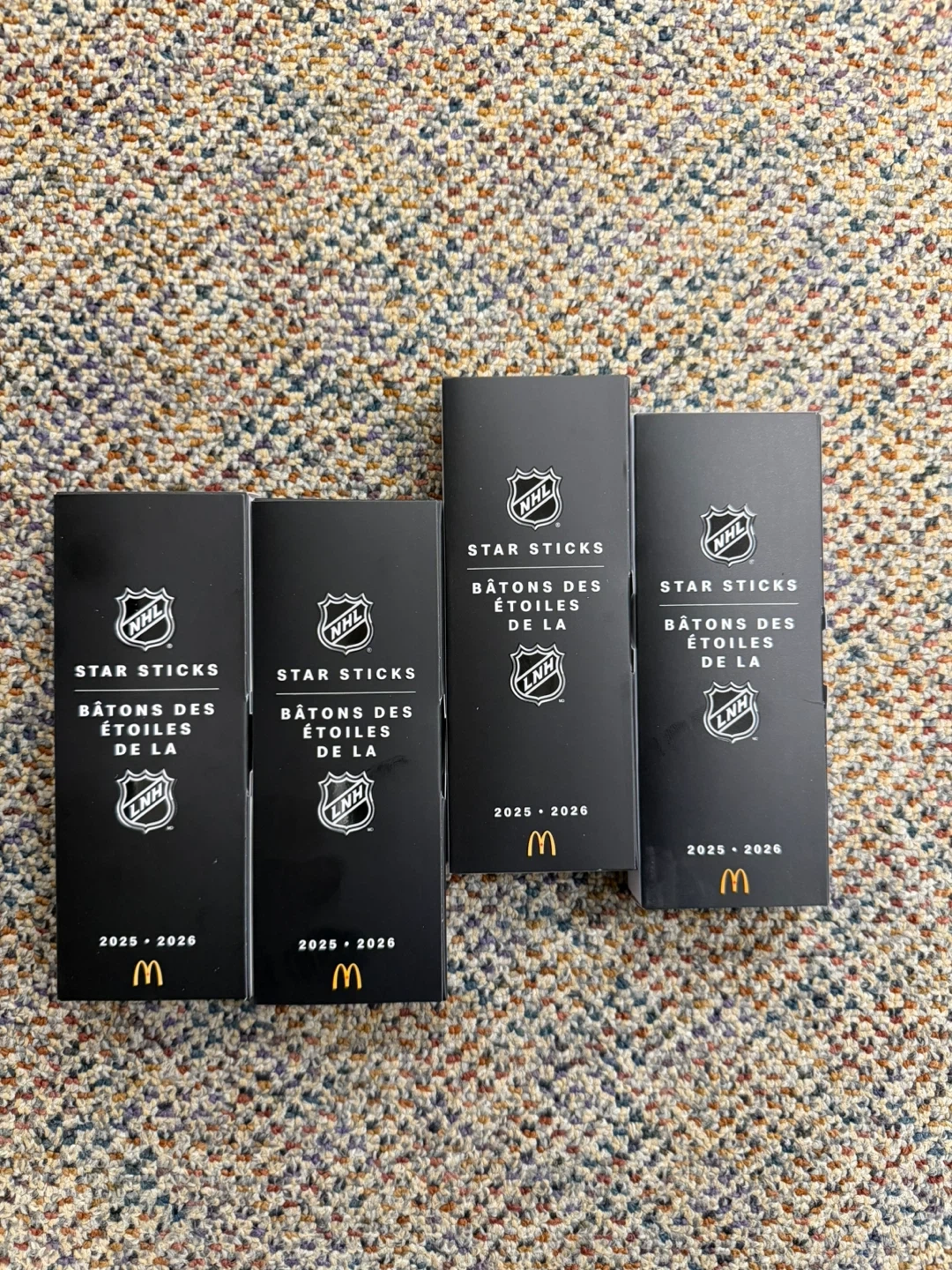 Four McDonald's NHL Star Sticks collectible boxes from the 2025-2026 season. Each box features NHL and LNH logos. These are part of a promotional event and are great for hockey fans!