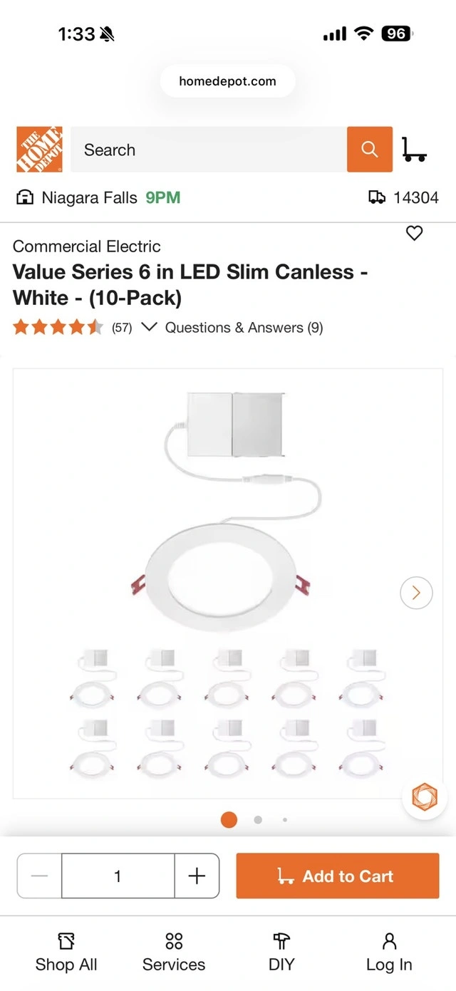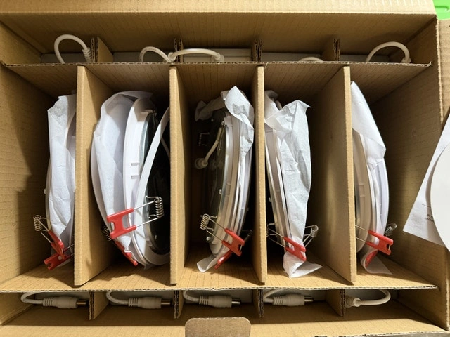 New Commercial Electric Value Series 6” LED Slim Canless Pot Light White (10-Pack). Light specs: 60-Watt equivalent integrated LED using only 10-Watt - 3000K soft white color temperature - 90 CRI for brighter colors; bright 650 Lumen; 35,000-hour, 24-year, lifespan. Thanks.