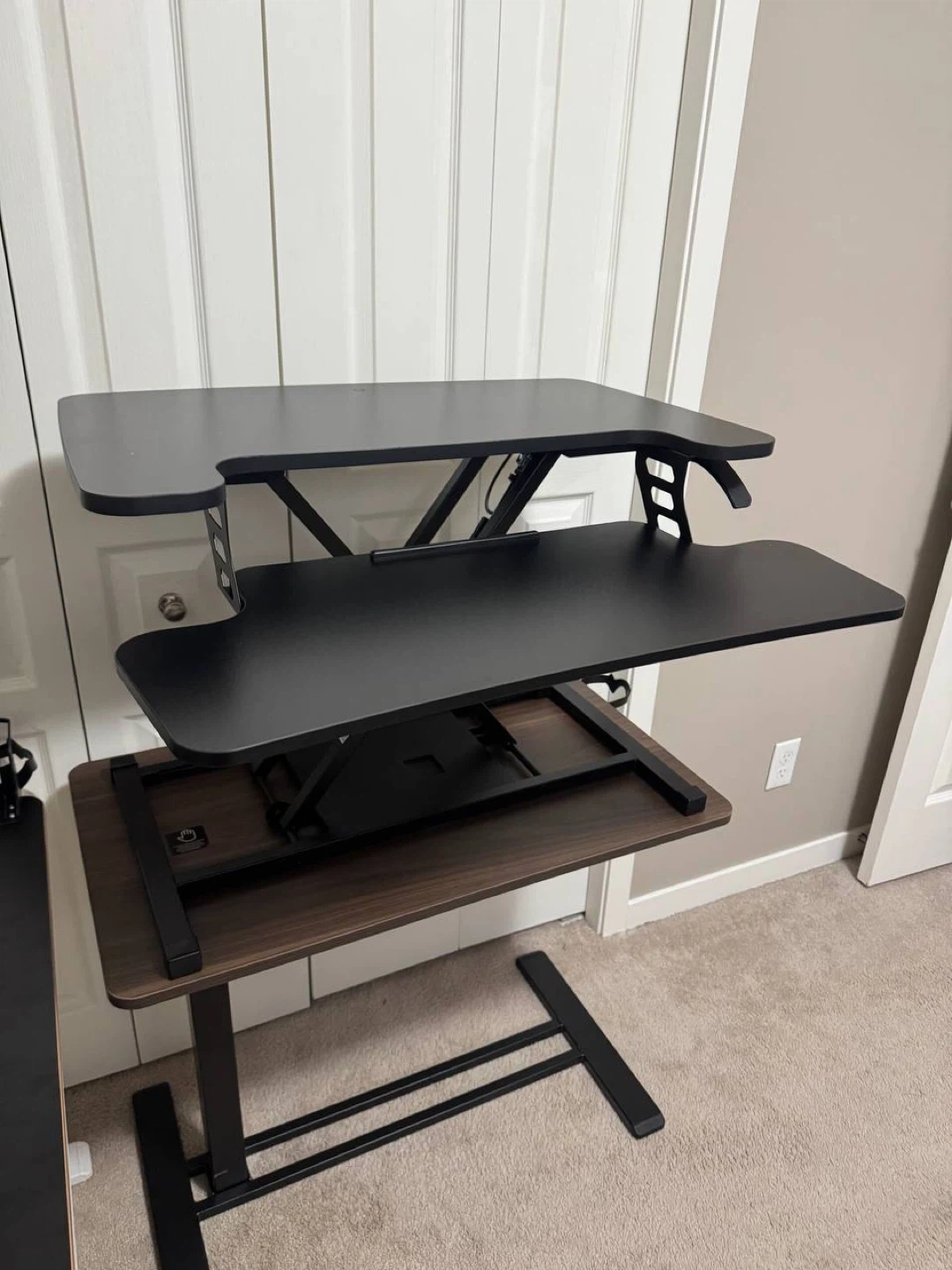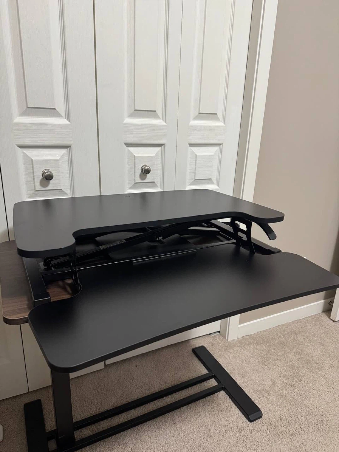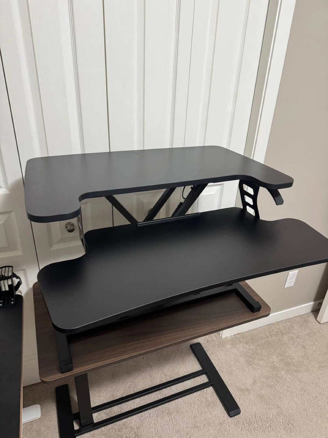 Selling a standing desk converter in black. It's in great condition and ready to help you work more comfortably! It can be placed on top of an existing desk to create a standing workspace