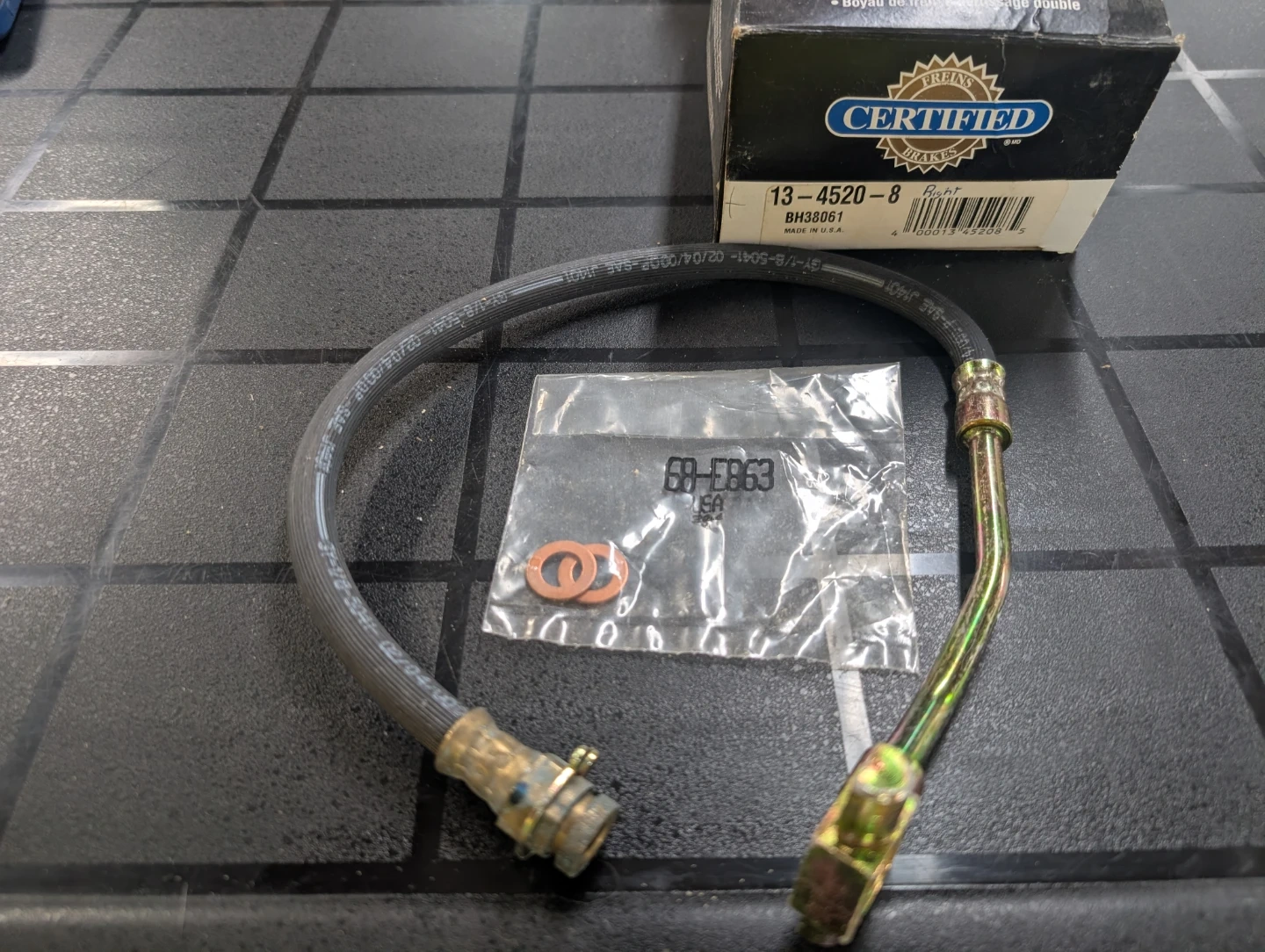 Certified Brakes 13-4520-8 brake hose for the right side. Made in USA. Includes two copper crush washers. The hose is marked SAE J1401.