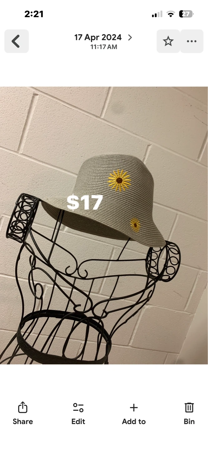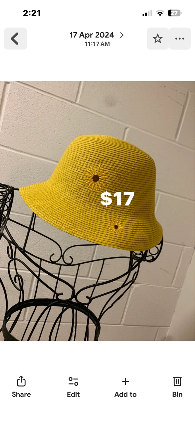17.00 each This charming bucket hat features a woven straw-like material. It's decorated with embroidered sunflowers on the front. A stylish accessory for sunny days!