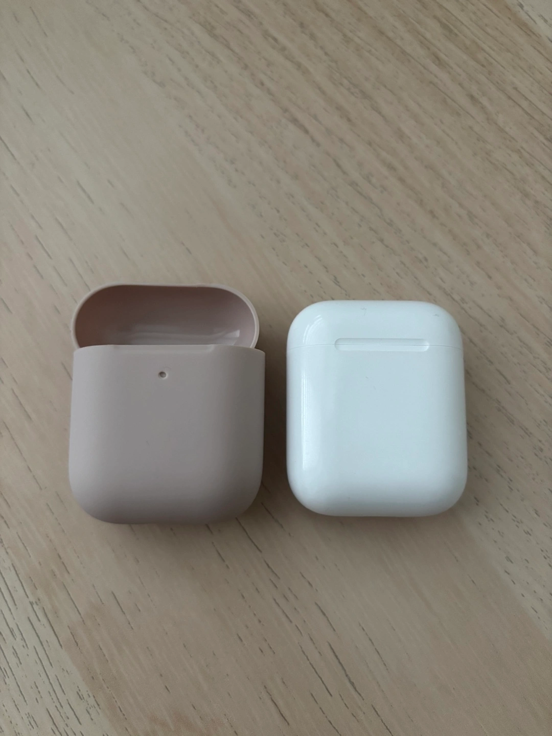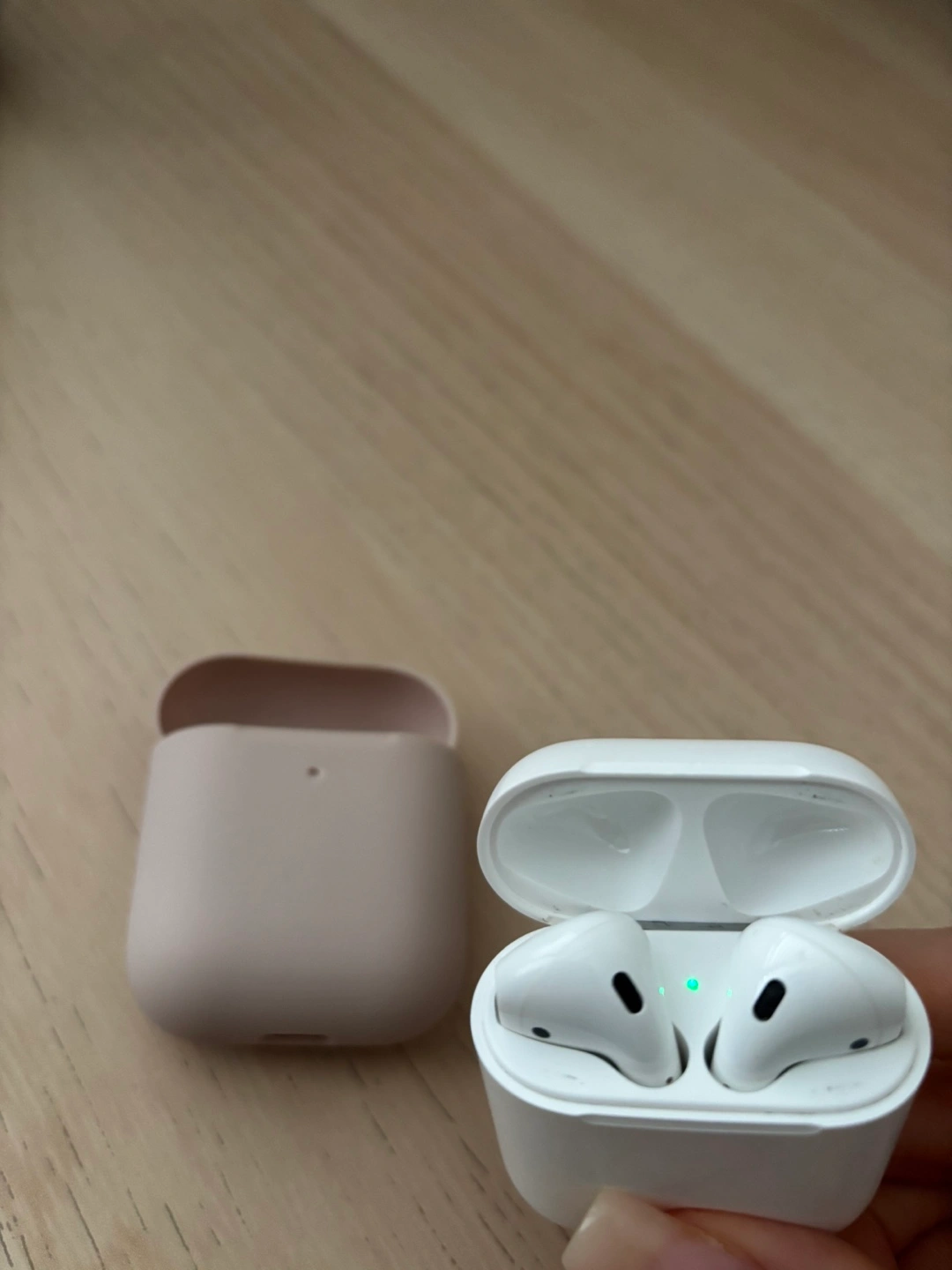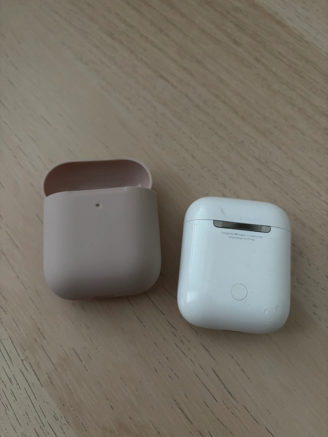 Wireless air pods (first gen) with charging case. Includes a pink silicone case. Right pod is a bit finicky and disconnects but will reconnect when you put back in case and then put back in ear.