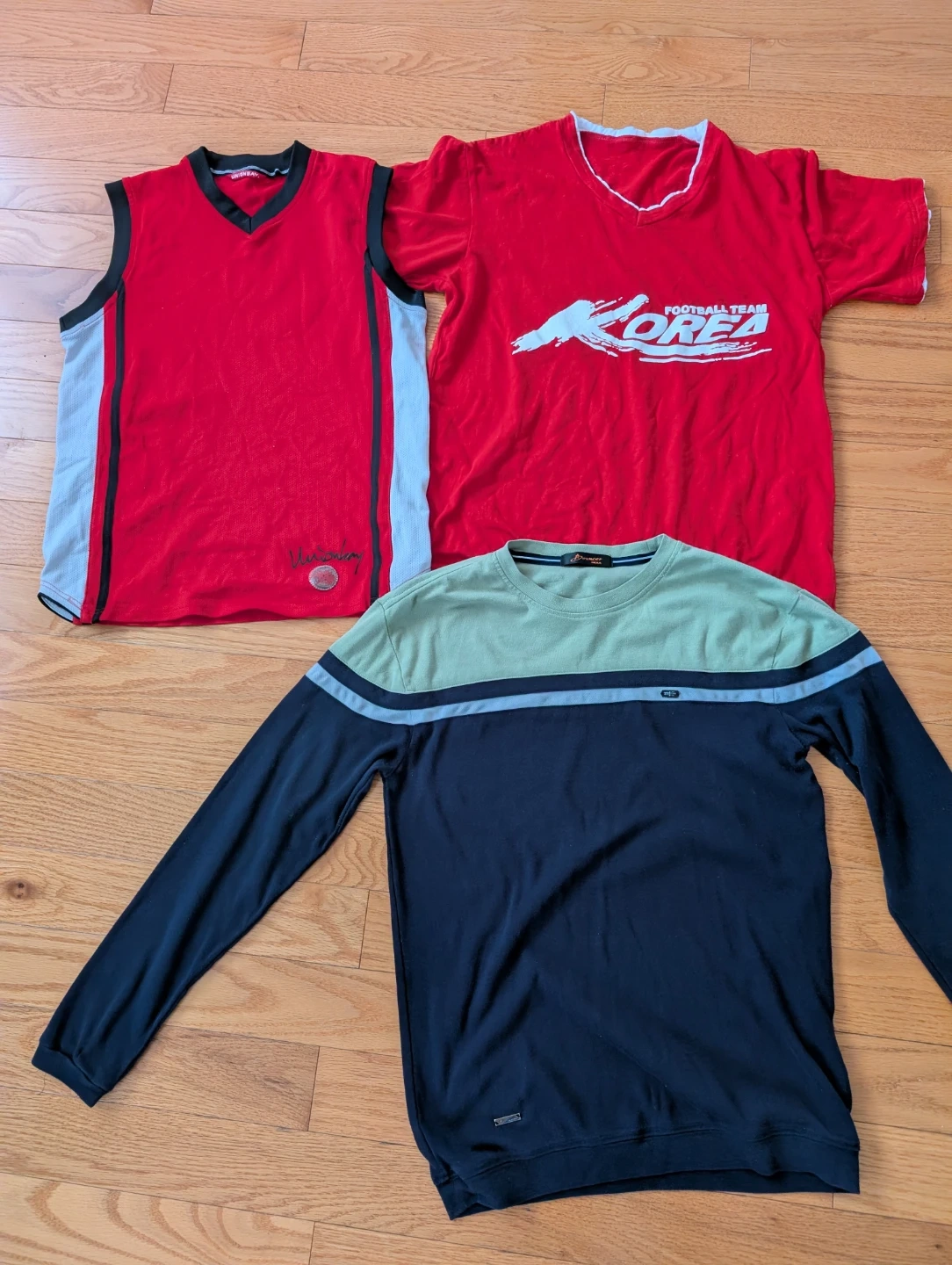 Selling a bundle of three tops. There's a red Korea football team t-shirt, a Unionbay tank top, and a long-sleeved shirt. All in good condition! s Size S or teen.