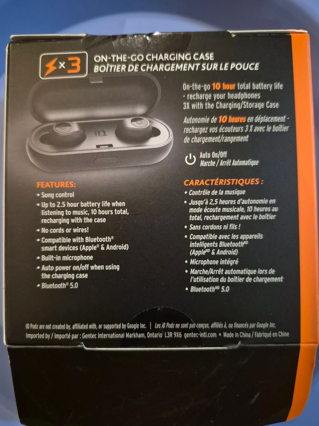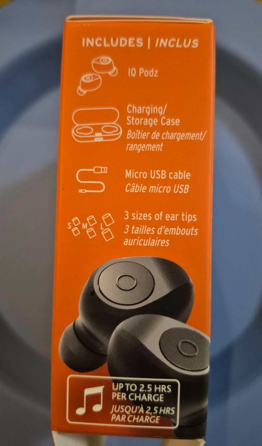 These iQ Podz 06 are true wireless headphones. They offer up to 2.5 hours of listening time on a single charge, with a total battery life of 10 hours when using the charging case. Includes charging case, micro USB cable, and 1 size of ear tips