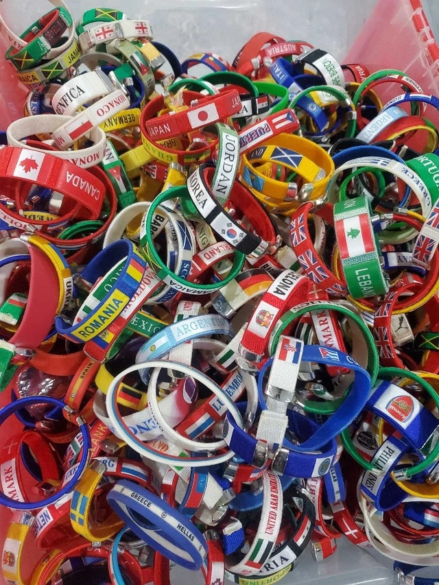 Add a touch of global flair to your wrist with these vibrant flag bracelets! These bracelets feature the flags of various countries, perfect for collectors or anyone wanting to show off their international spirit. Each bracelet is made with colourful woven fabric and has a snap closure. They are designed to fit comfortably on most wrists. 1 for $5 or 3 for $10. Cash accepted.