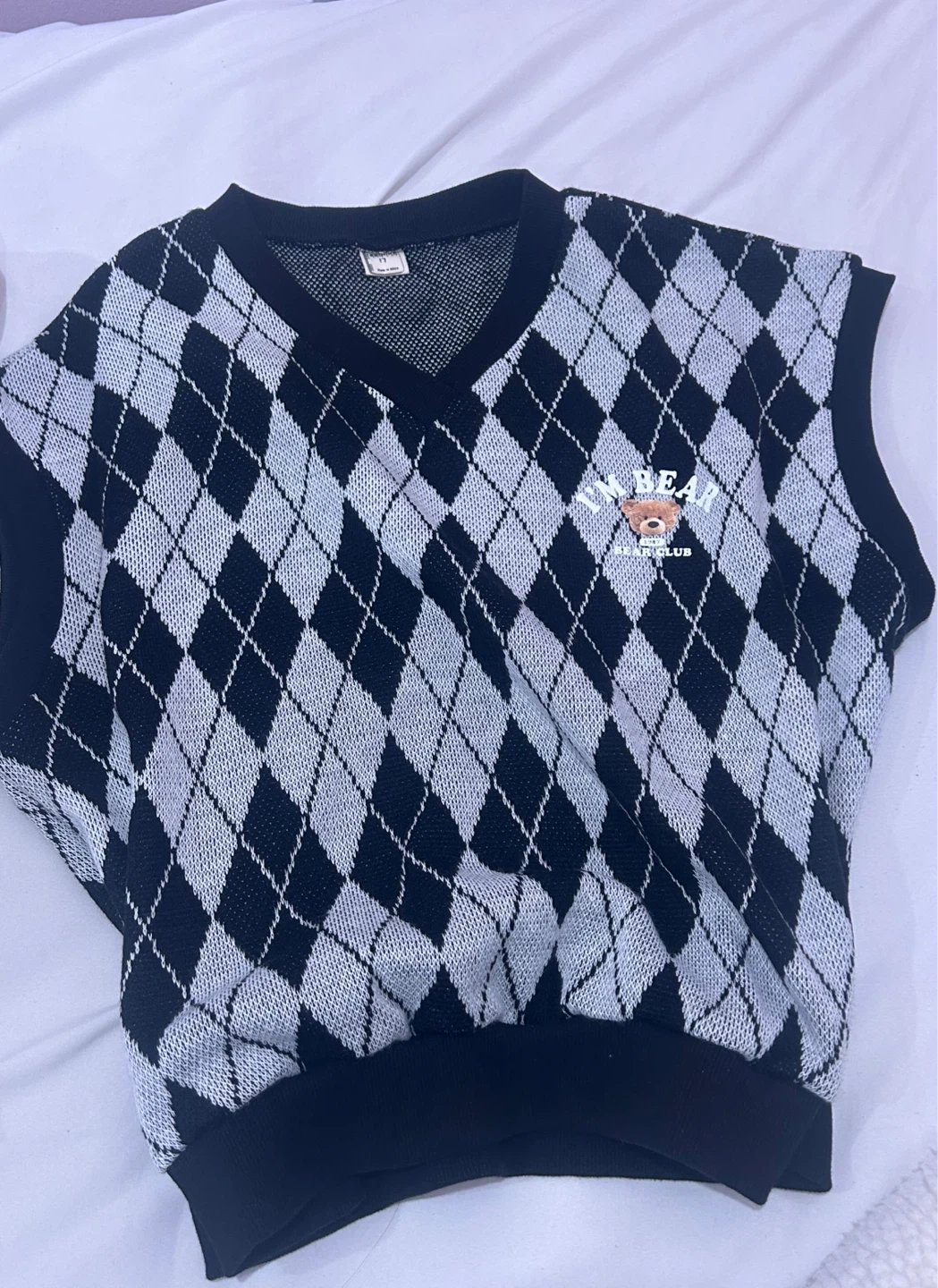 This sleeveless knit vest features a classic black and white argyle pattern. It has a v-neck and a small embroidered bear graphic with the text 'Bear Club' on the front. It's great for layering over shirts.