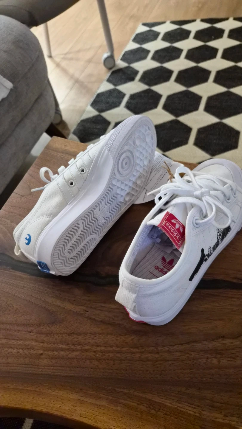 These white Adidas Nizza sneakers feature a fun Star Wars graphic print. They're a size 6 UK / 37 EU, made from durable canvas. Perfect for casual wear!