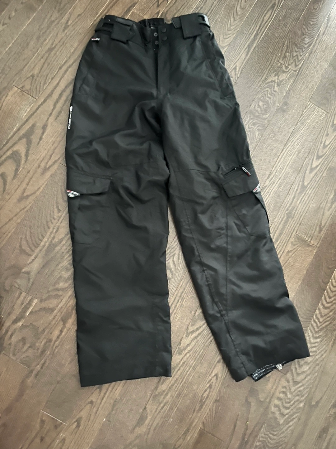 Men's black snow pants. Features cargo pockets and adjustable waist. Good for snowboarding or skiing.