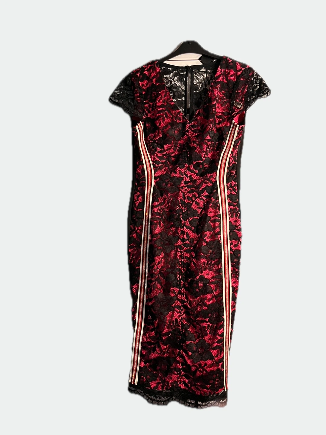 This dress features a beautiful red and black lace design. It has short sleeves and a flattering silhouette. Perfect for a night out or a special occasion!
