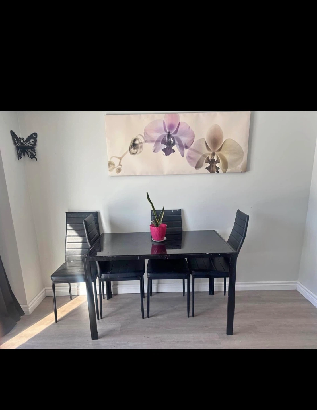 A black dining table with four matching chairs. Table and chairs have a sleek, modern design. Perfect for smaller dining spaces.
