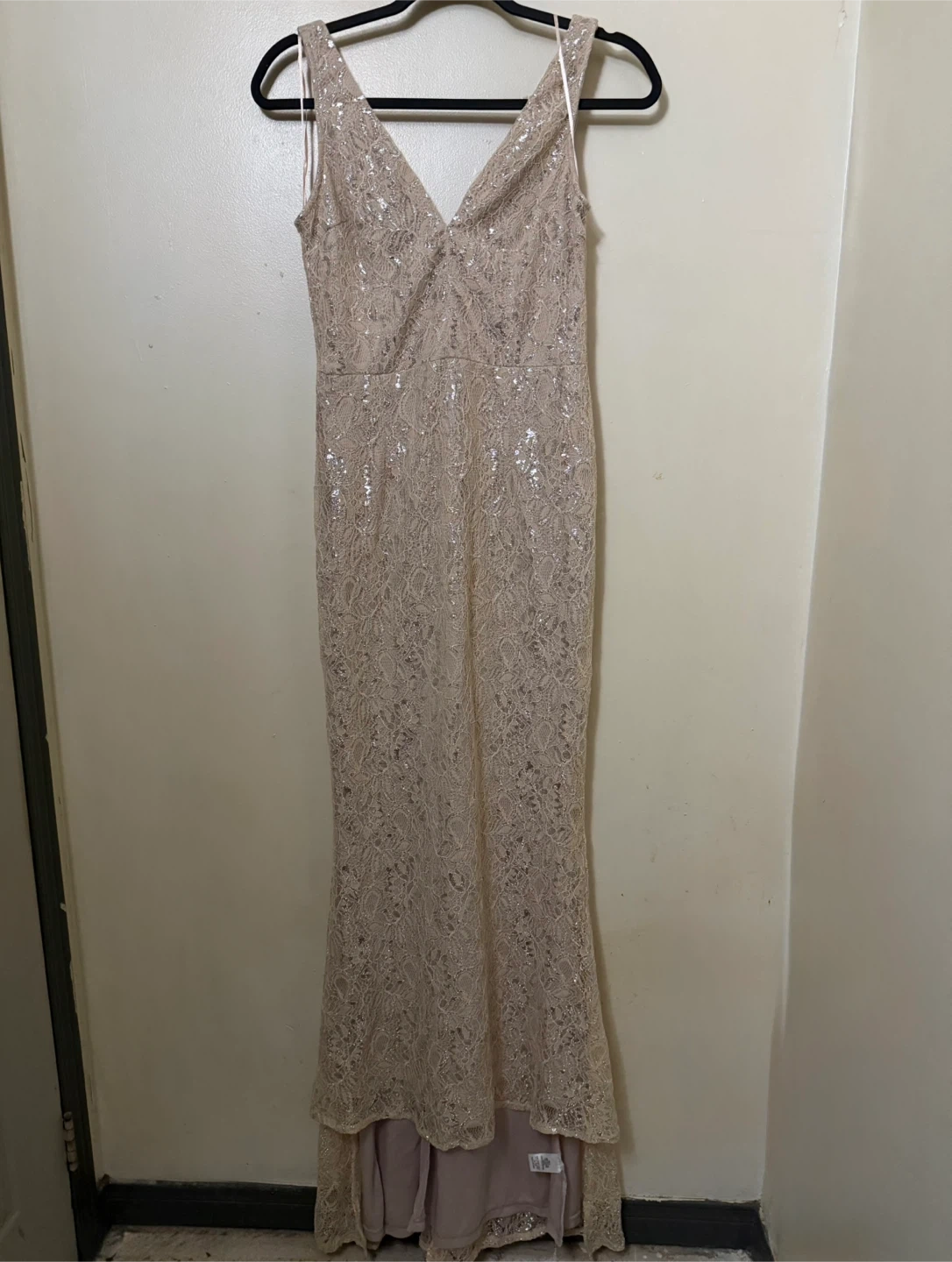 This dress features a champagne colour with delicate sequin lace detailing. Perfect for a special occasion and ready for a new home!