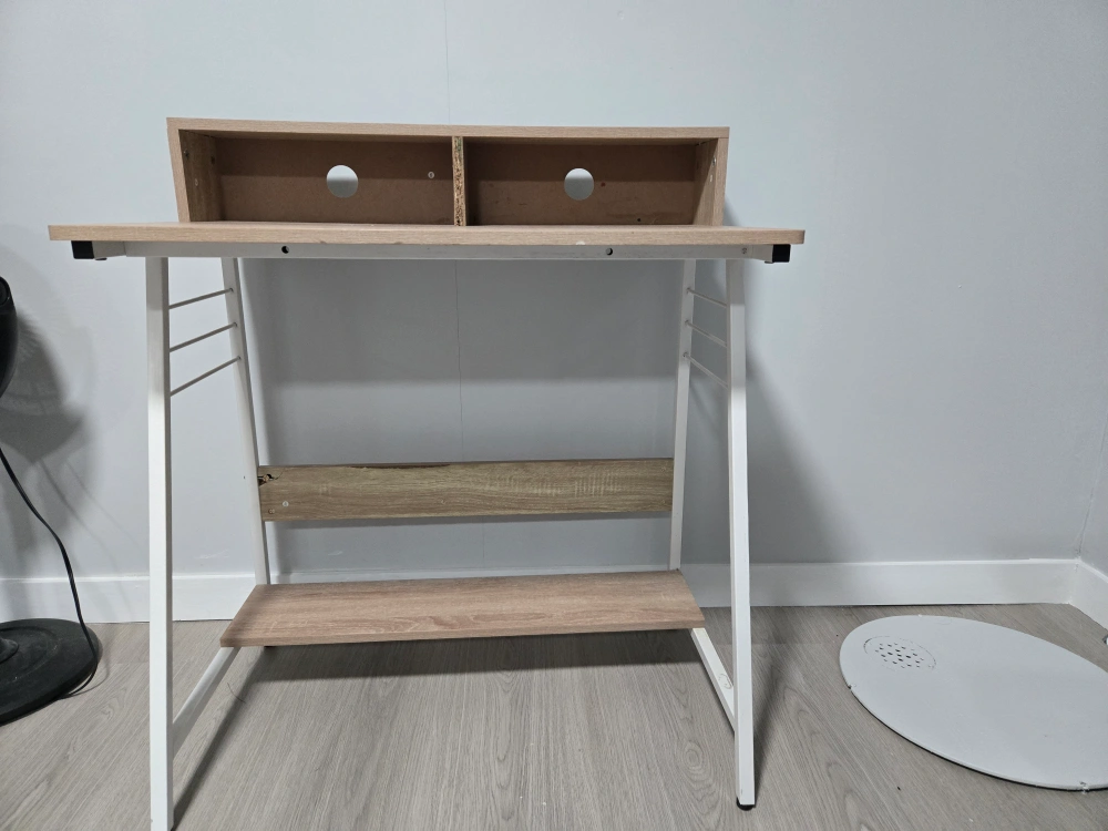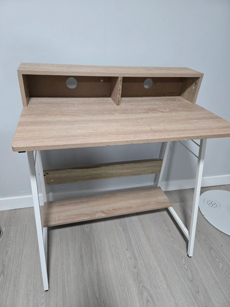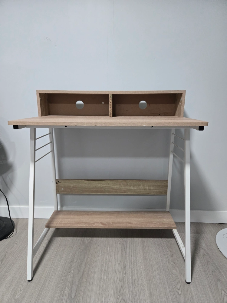 A compact computer or study desk with a wood-grain finish and white metal legs. It features a raised shelf with two openings for cable management. Below the main surface, there's a lower shelf for additional storage. This desk is a great spot for a computer setup or study table.