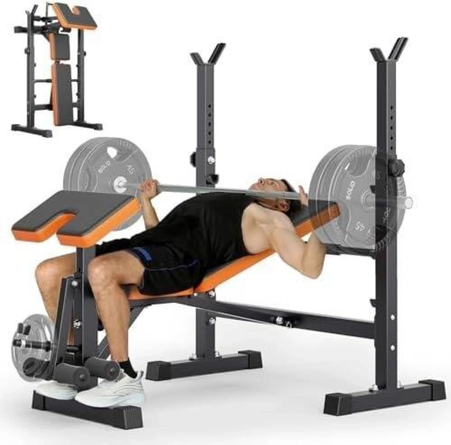 This versatile weight bench set offers 6-in-1 functionality for a full-body workout. It features a multi-adjustable bench press with adjustable barbell height and back pad positions. Suitable for limited space, it folds quickly to save 80% of space!