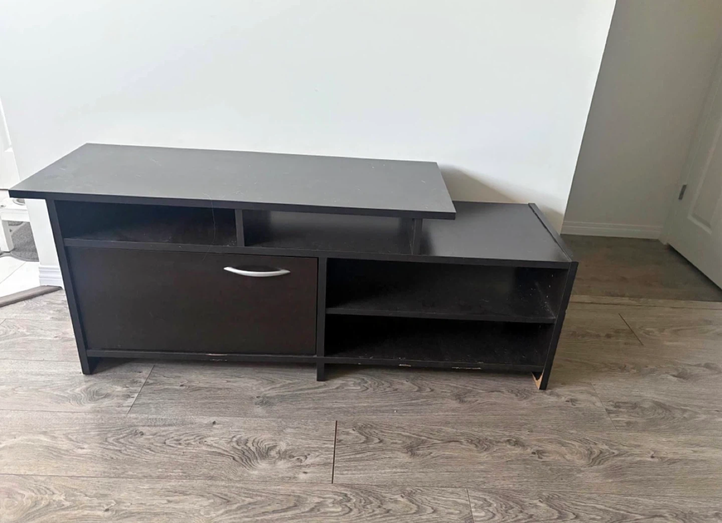 Dark brown TV stand with open shelving and two drawers for storage. It's great for organizing media consoles and accessories. Perfect for a living room or den!