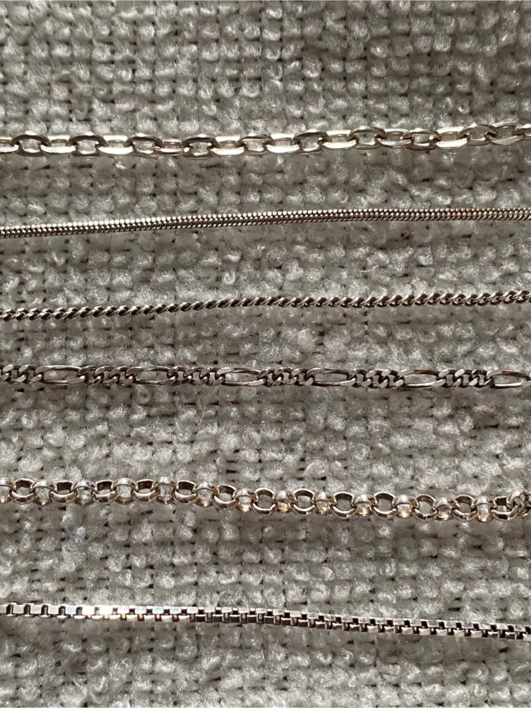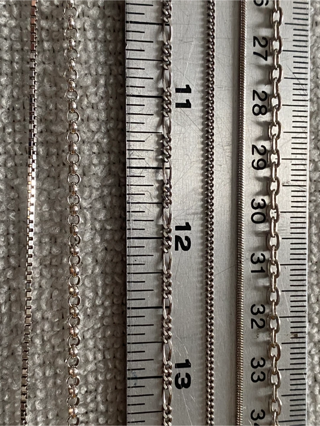 Five different 925 sterling silver chains, a box chain, a figaro chain, a snake chain, a rope chain, and a curb chain. Different lengths.$20 each